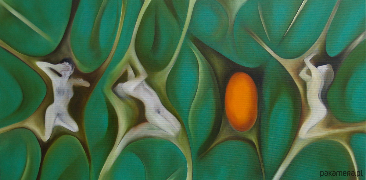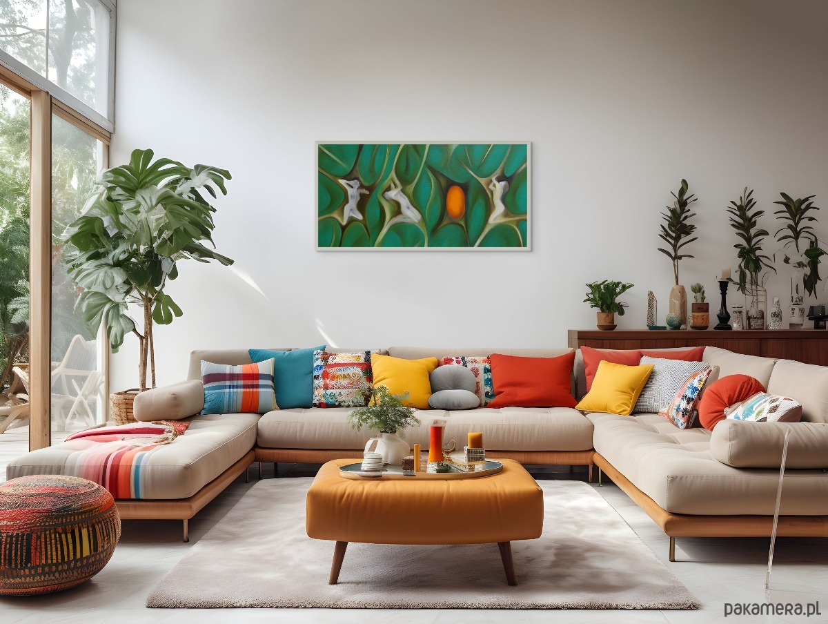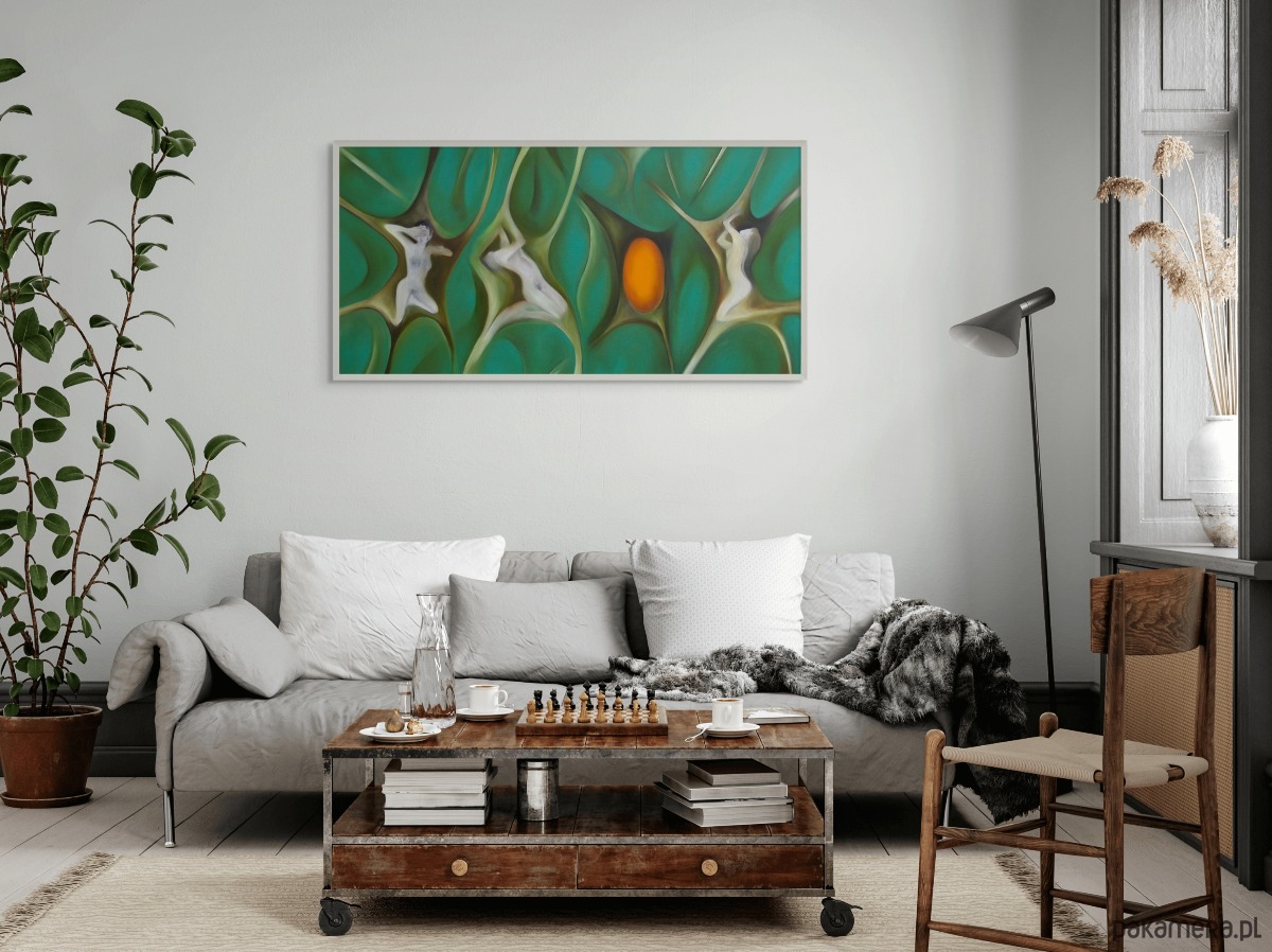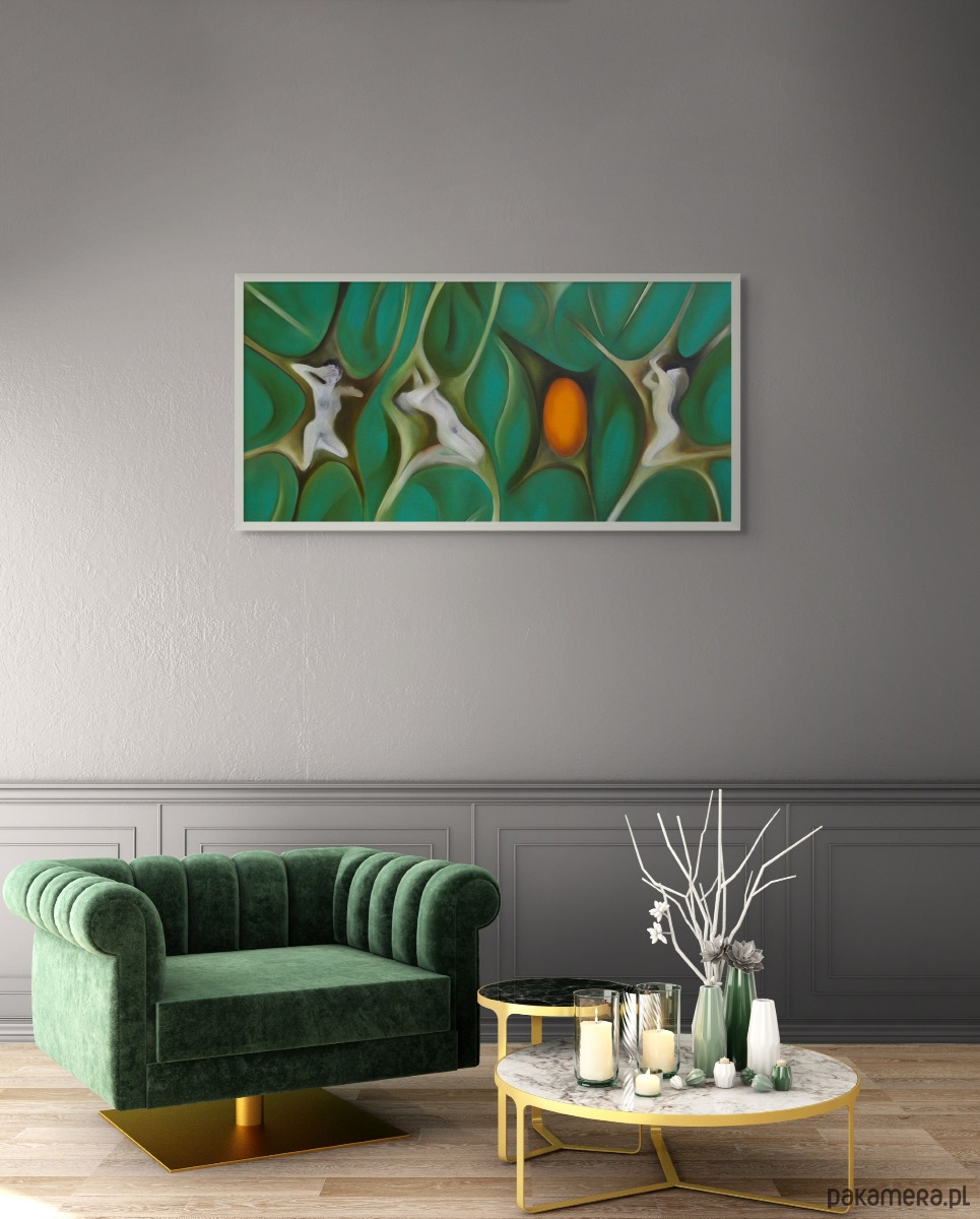 To praca, która buduje nastrój poprzez kolor, fakturę i miękkie przejścia form. Widoczne są delikatne odniesienia do postaci ludzkich, jednak całość pozostaje otwarta i nieoczywista — dzięki temu obraz dobrze sprawdza się jako element nowoczesnych wnętrz.