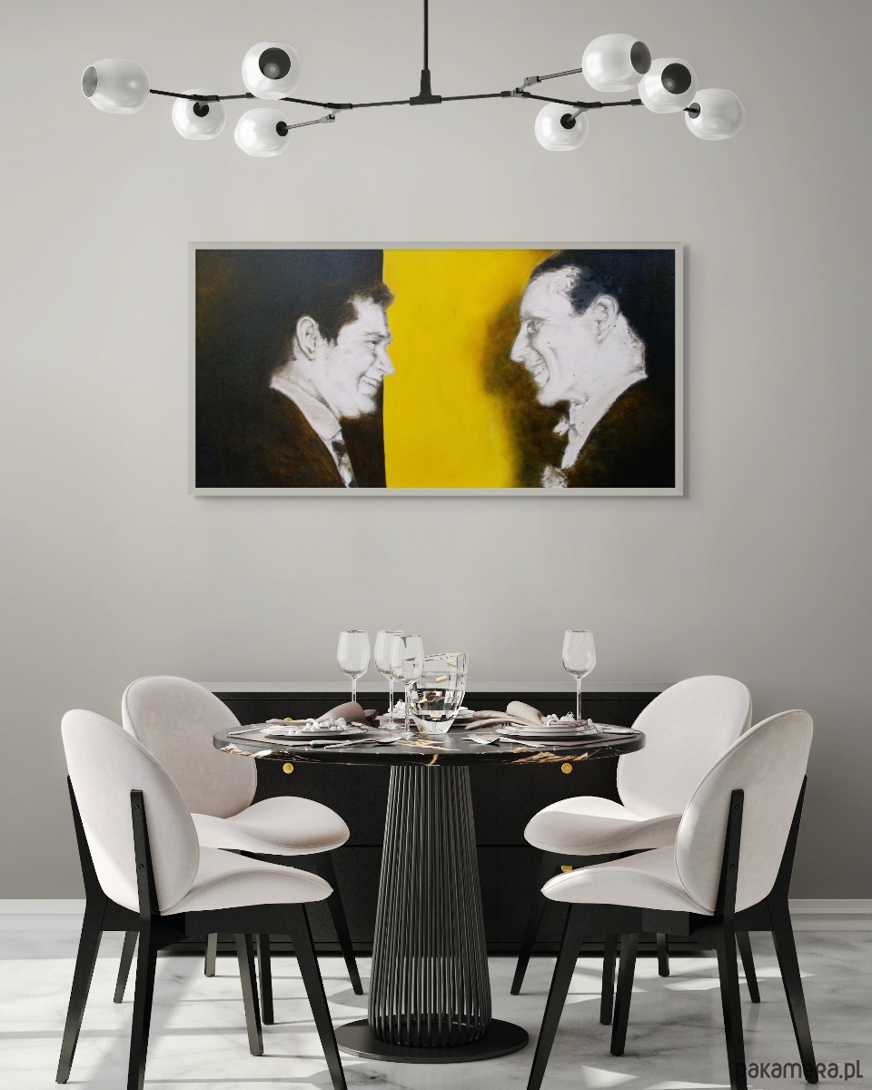 To praca, która buduje nastrój poprzez kolor, fakturę i miękkie przejścia form. Widoczne są delikatne odniesienia do postaci ludzkich, jednak całość pozostaje otwarta i nieoczywista — dzięki temu obraz dobrze sprawdza się jako element nowoczesnych wnętrz.