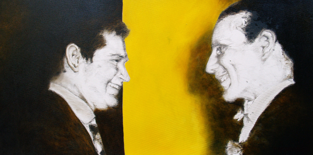Obraz olejny na płótnie, łączący abstrakcję z subtelnymi elementami figuratywnymi.