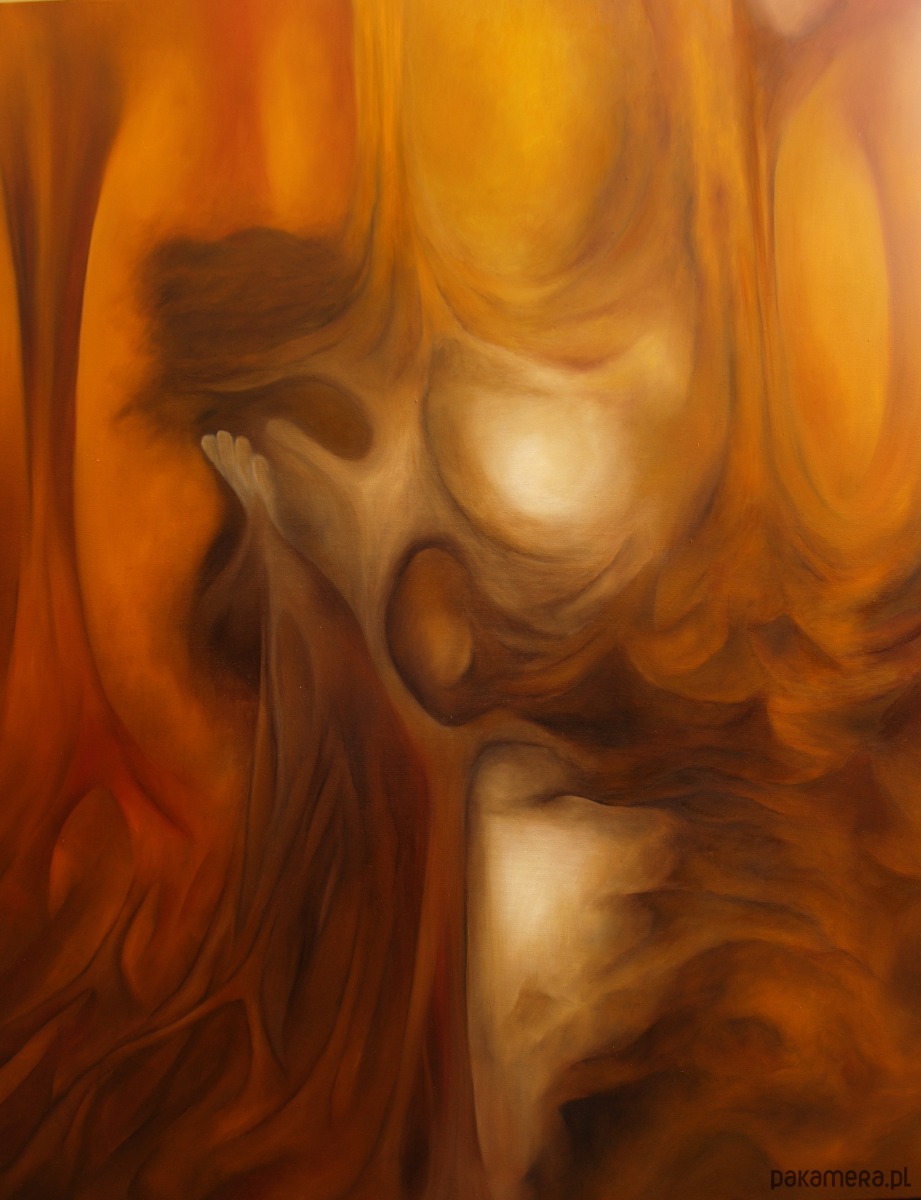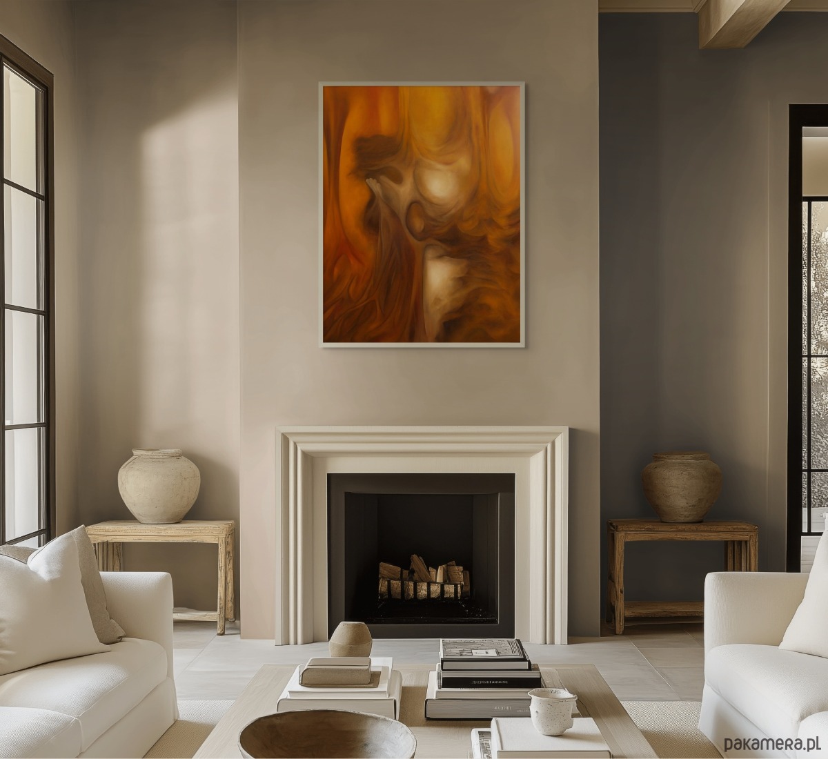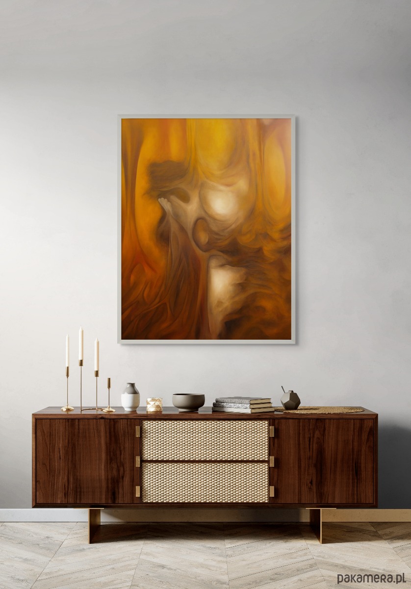 To praca, która buduje nastrój poprzez kolor, fakturę i miękkie przejścia form. Widoczne są delikatne odniesienia do postaci ludzkich, jednak całość pozostaje otwarta i nieoczywista — dzięki temu obraz dobrze sprawdza się jako element nowoczesnych wnętrz.