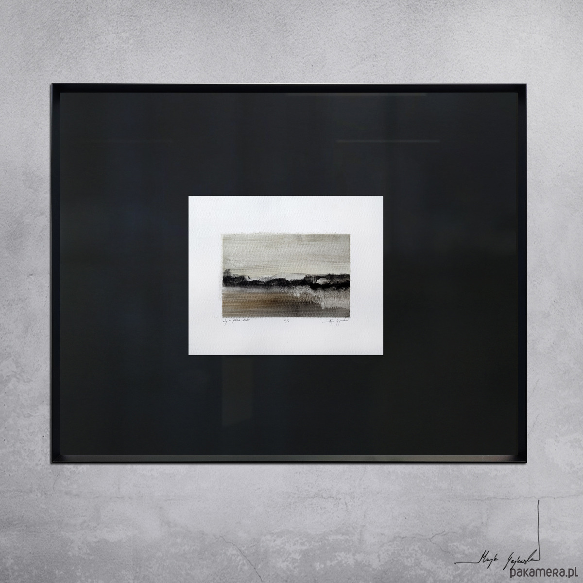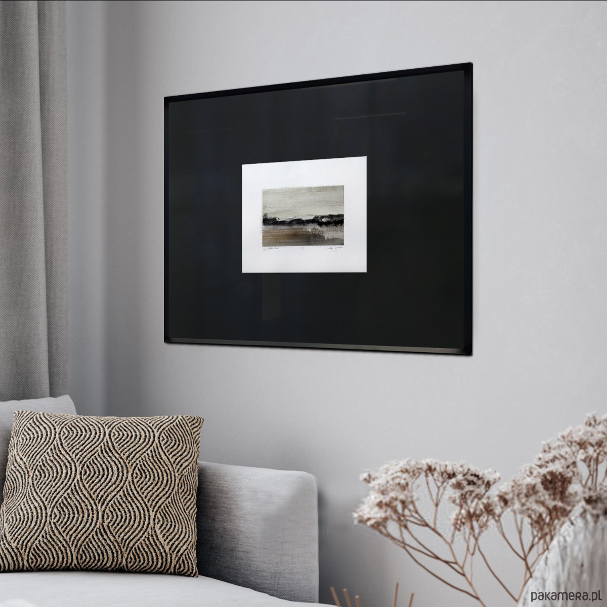 Wymiary całości z oprawą - 40x50 cm. Obraz oprawiony w czarną aluminiową ramę i antracytowe passe partout.