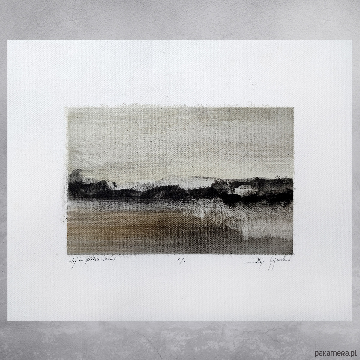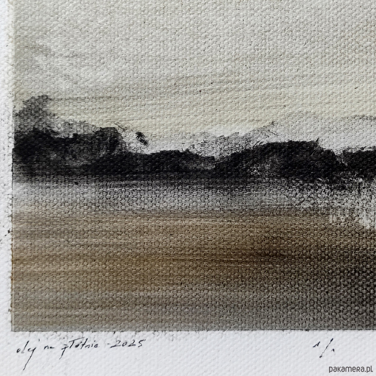Obraz olejny w sepii wykonany na białym płótnie malarskim.