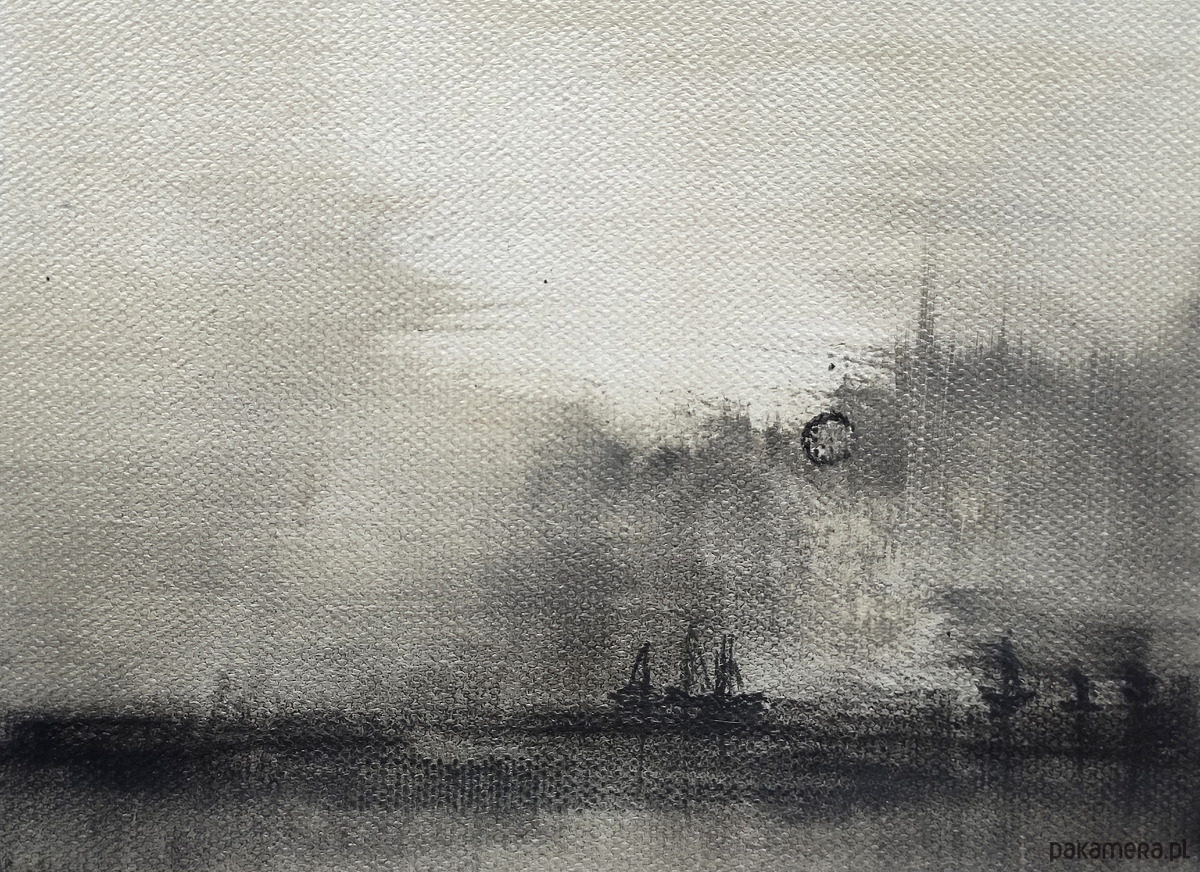 Poziomy pejzaż przywołujący na myśl kadry widziane z okien jadącego samochodu lub pociągu. Rzeczywistość dynamiczna, nieuchwytna i niedopowiedziana.