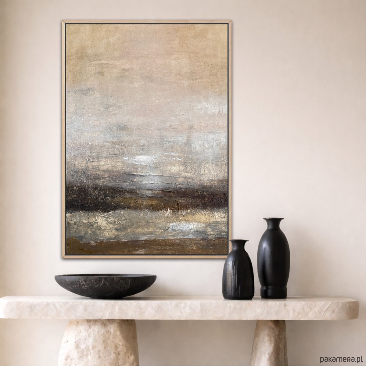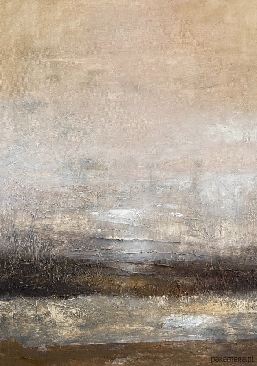 Rozległa przestrzeń mokradła, zanurzona w ciepłych beżach, zgaszonych brązach i delikatnych szarościach, otula spojrzenie spokojem. Strukturalna faktura farby buduje krajobraz niemal dotykalny – ziemia, trawy i woda przenikają się, tworząc subtelną grę światła i cienia. Horyzont rozmywa się miękko, jak wspomnienie miejsca, w którym kiedyś było się naprawdę obecnym.