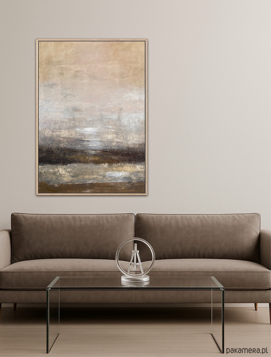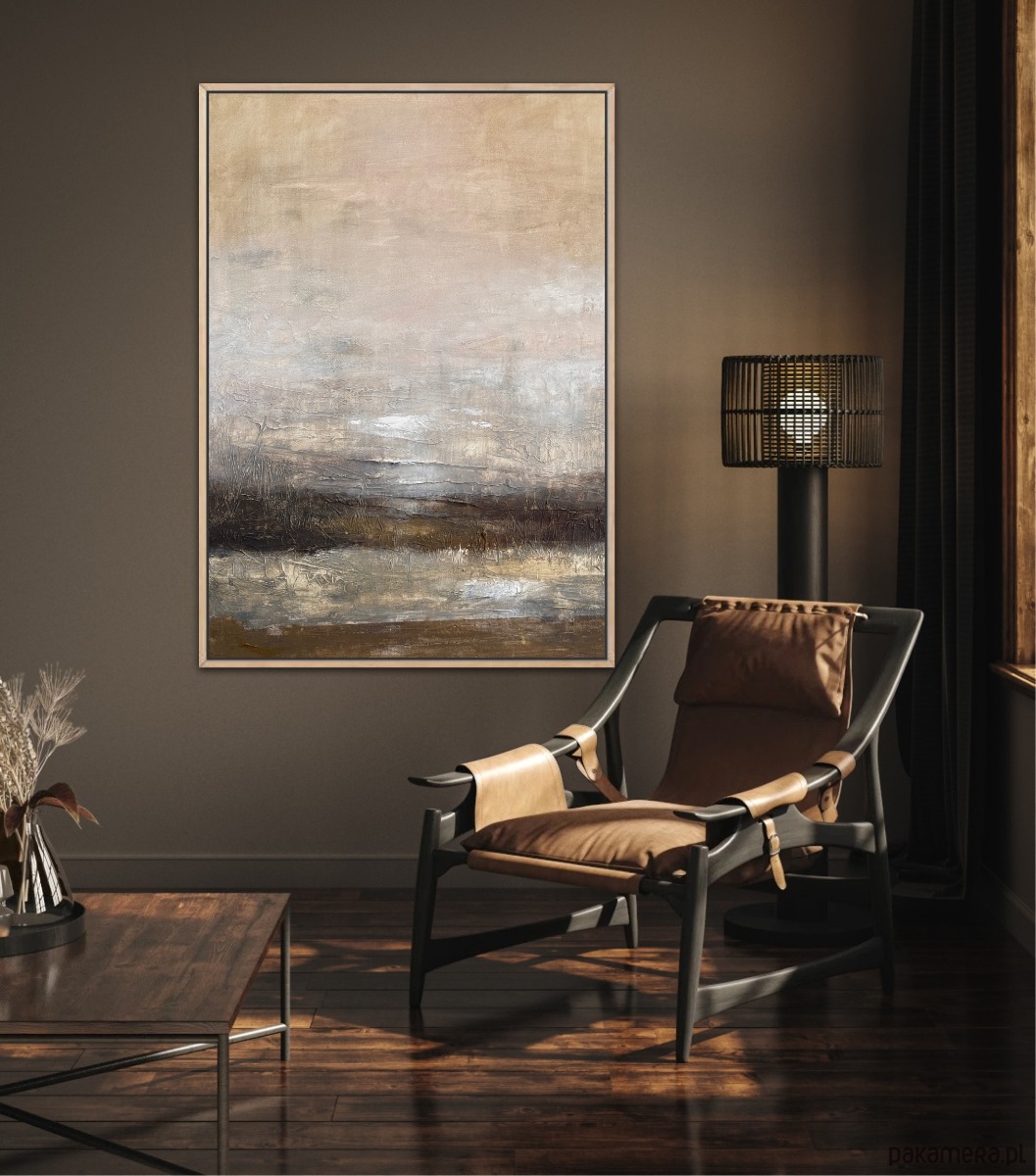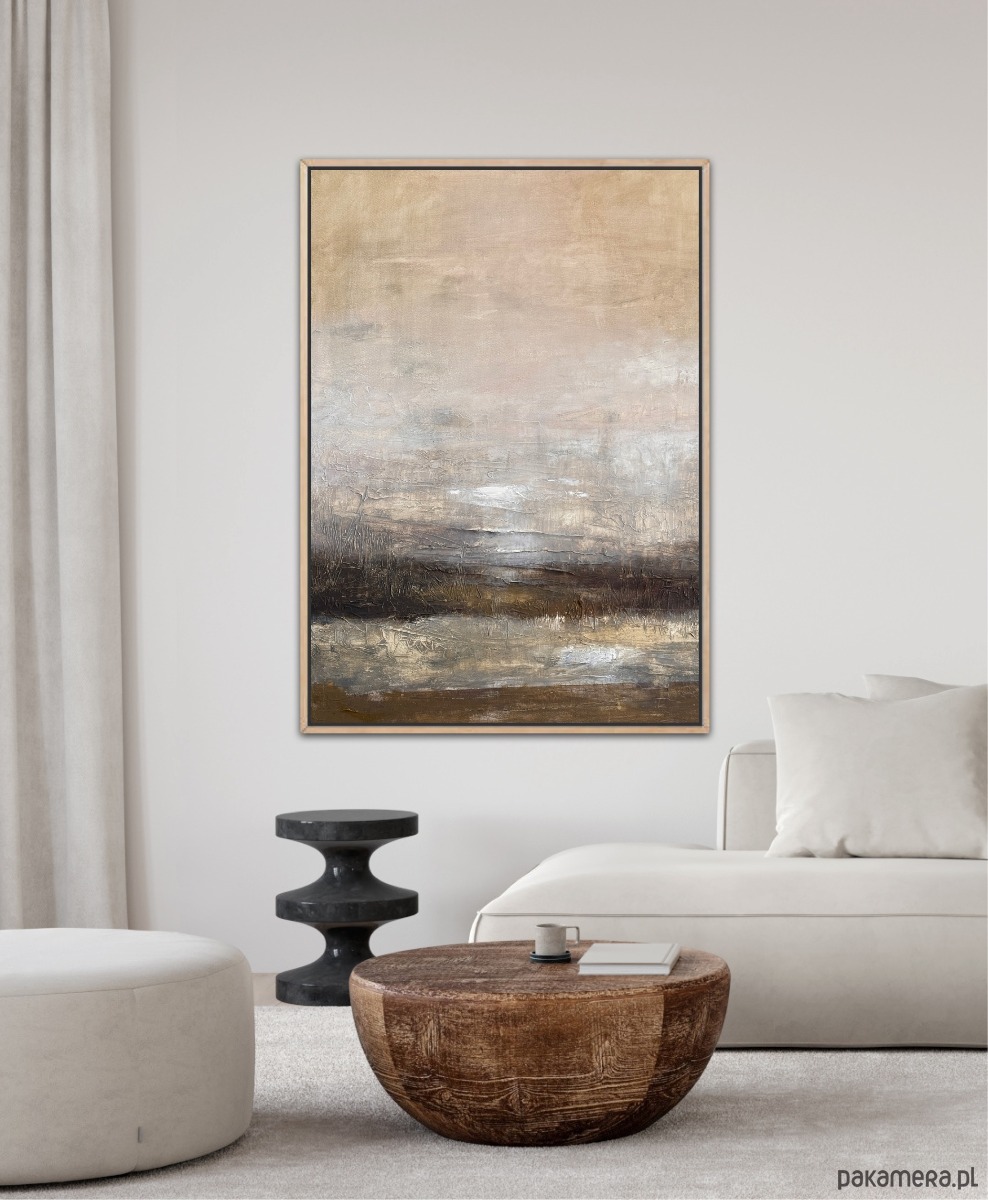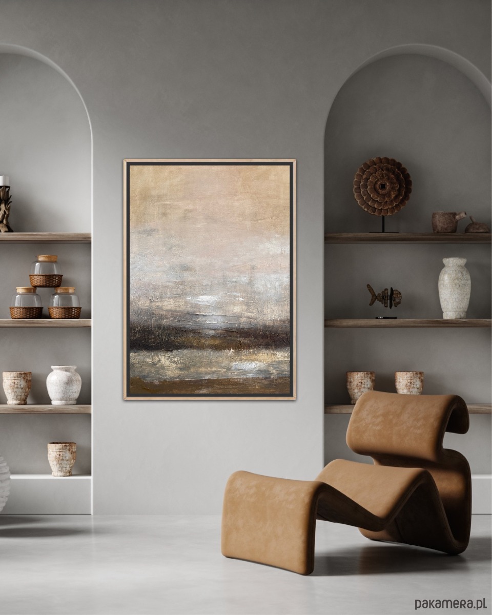 Obraz doskonale odnajdzie się w naturalnych, stonowanych wnętrzach – w przestrzeniach, gdzie ważna jest harmonia, światło i oddech. Jego kolorystyka ziemi i delikatna, organiczna faktura wprowadzą do wnętrza ciepło oraz subtelną elegancję.