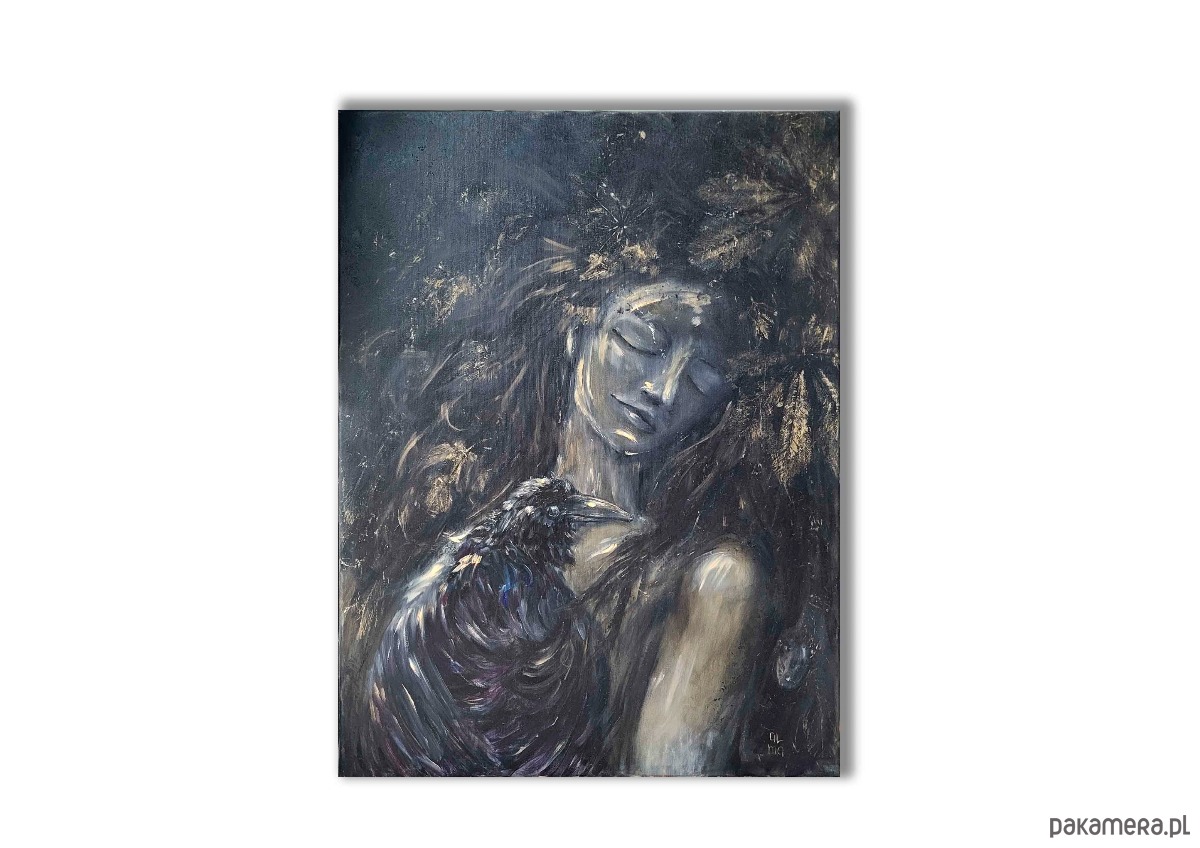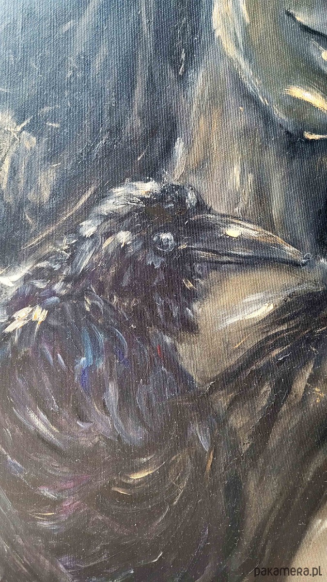 Obraz olejny ręcznie malowany 60x80cm "Kruk" las czarny
