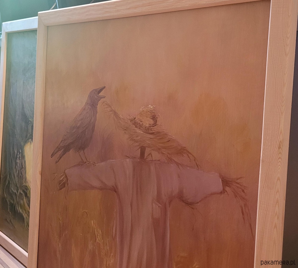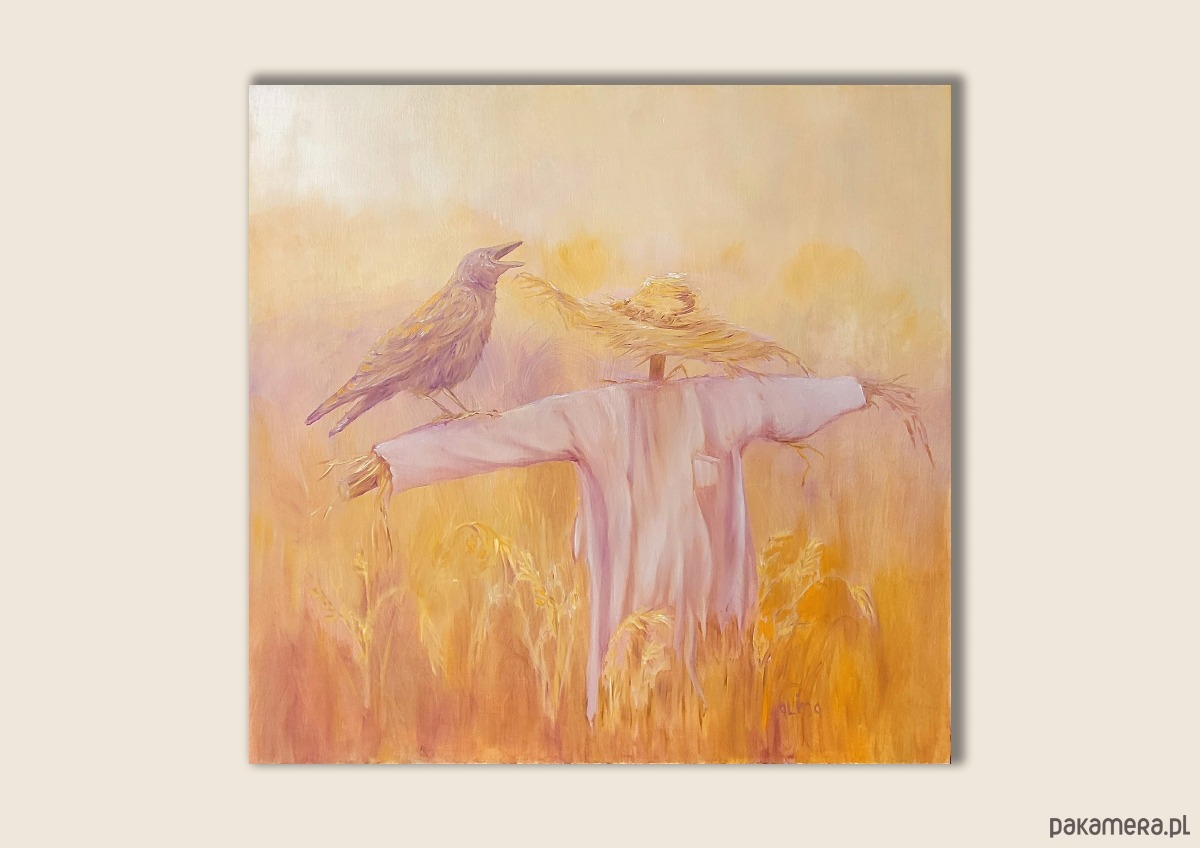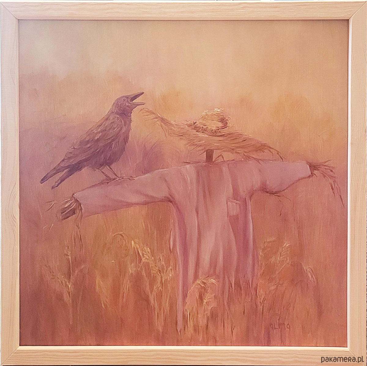 Obraz olejny ręcznie malowany autorski "Kruk i Strach na wróble" + rama
