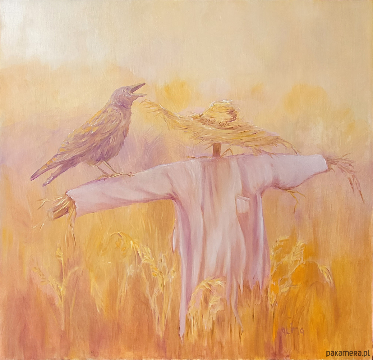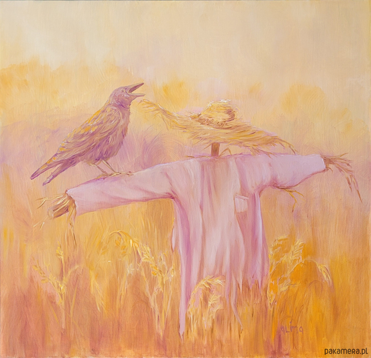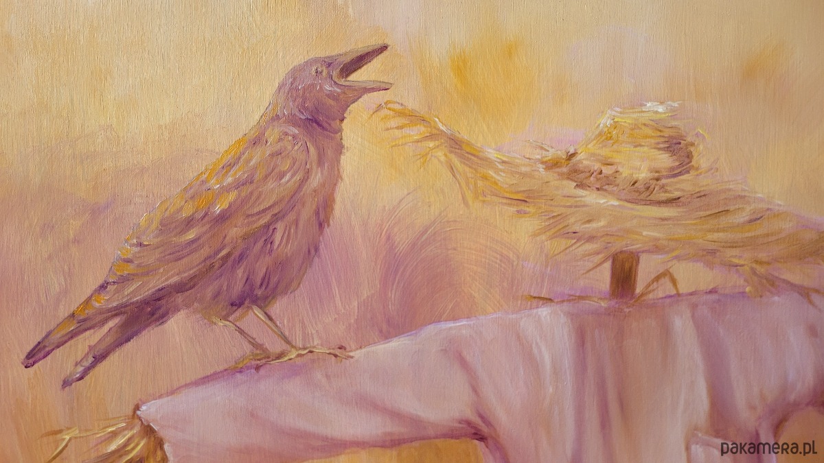 Obraz olejny ręcznie malowany autorski "Kruk i Strach na wróble" + rama