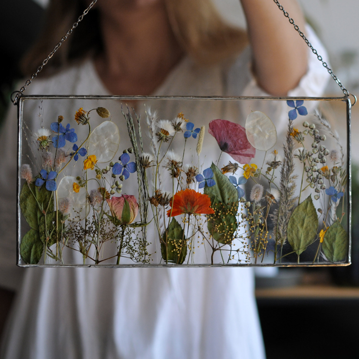 Szklany witraż z dekoracją z suszonych kwiatów i polnych roślin.