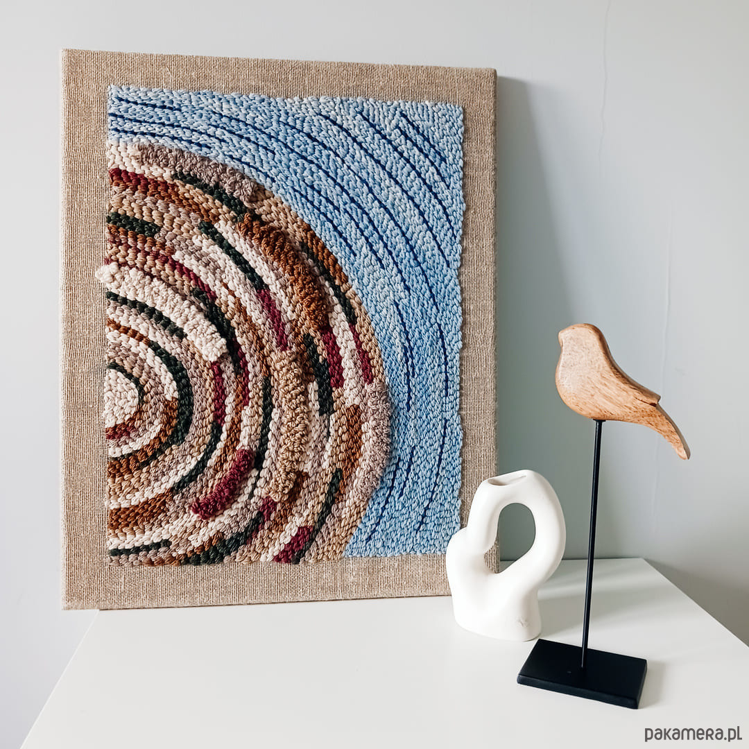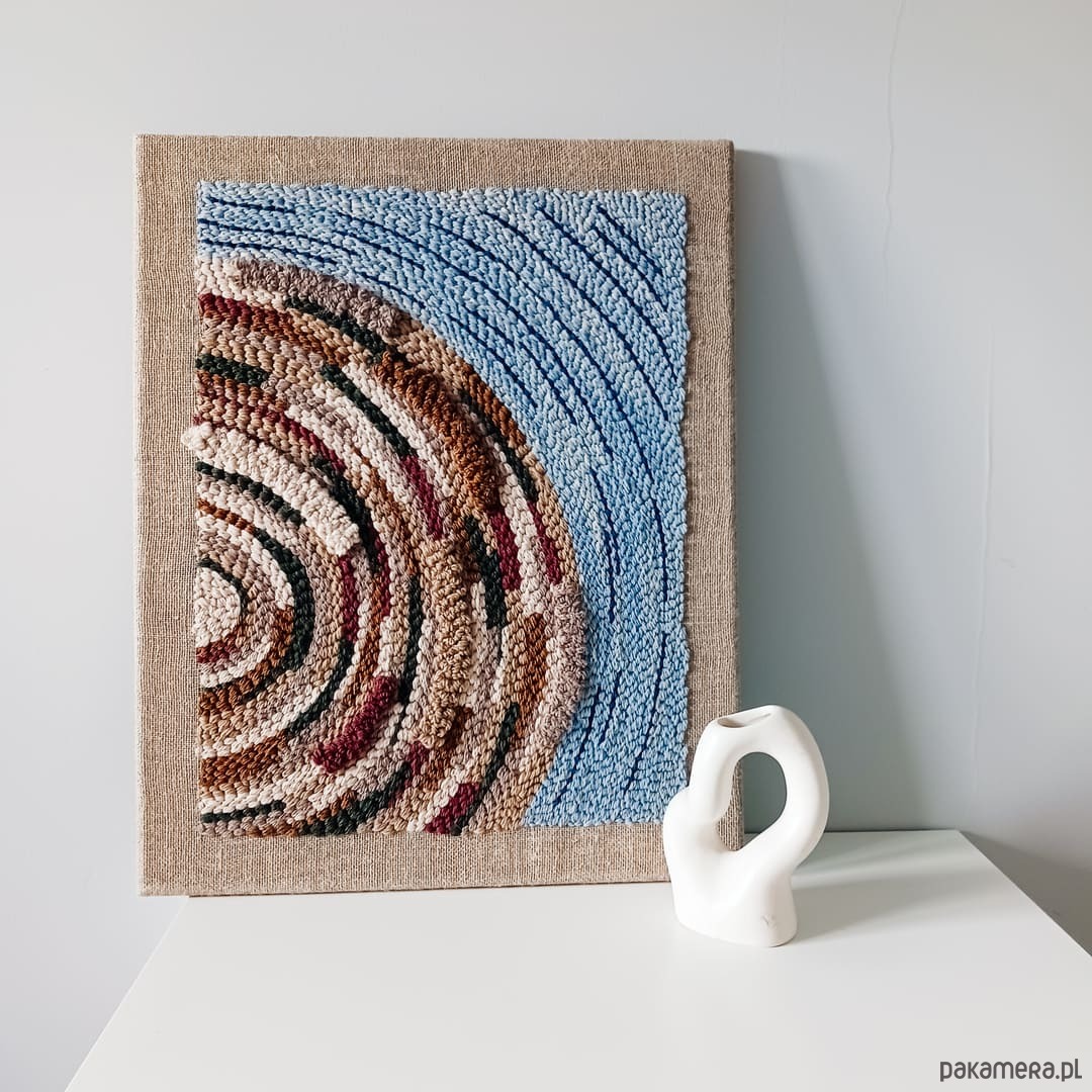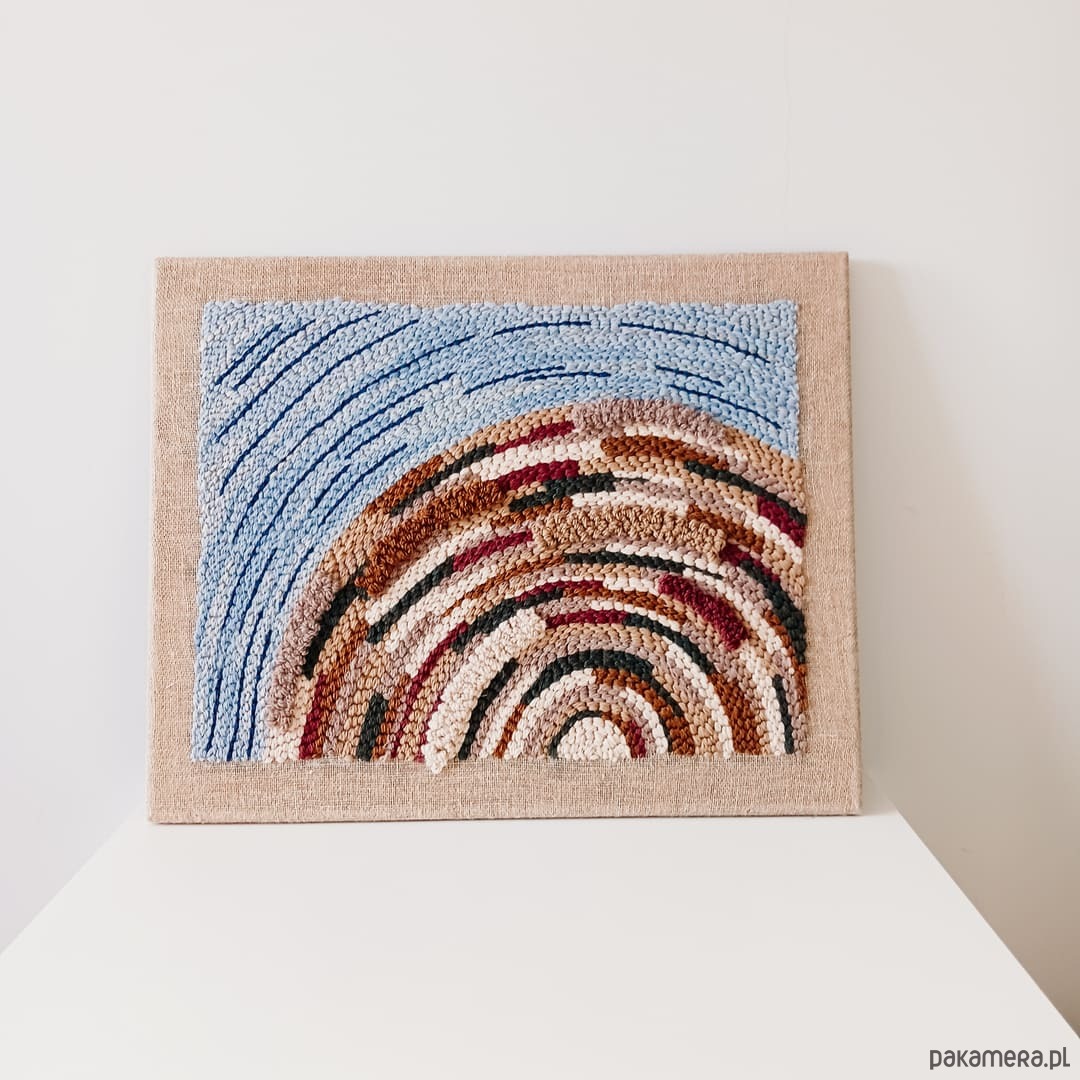 Autorski obraz wykonany techniką punch needle, który łączy w sobie rzemiosło i nowoczesną estetykę. Abstrakcyjny motyw w odcieniach beżu, brązu, czerwieni i błękitu przyciąga wzrok i wnosi do wnętrza harmonię oraz energię. Każdy detal został wykonany ręcznie z miękkiej, wełnianej włóczki na naturalnym lnianym podkładzie.
