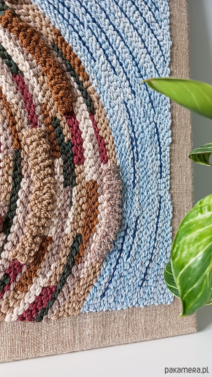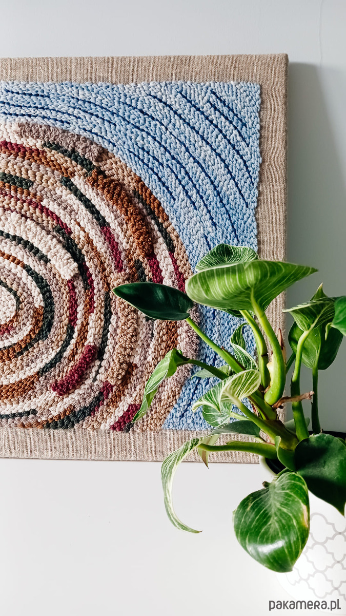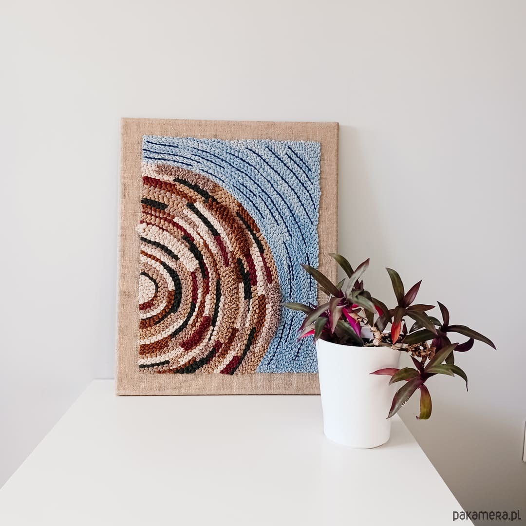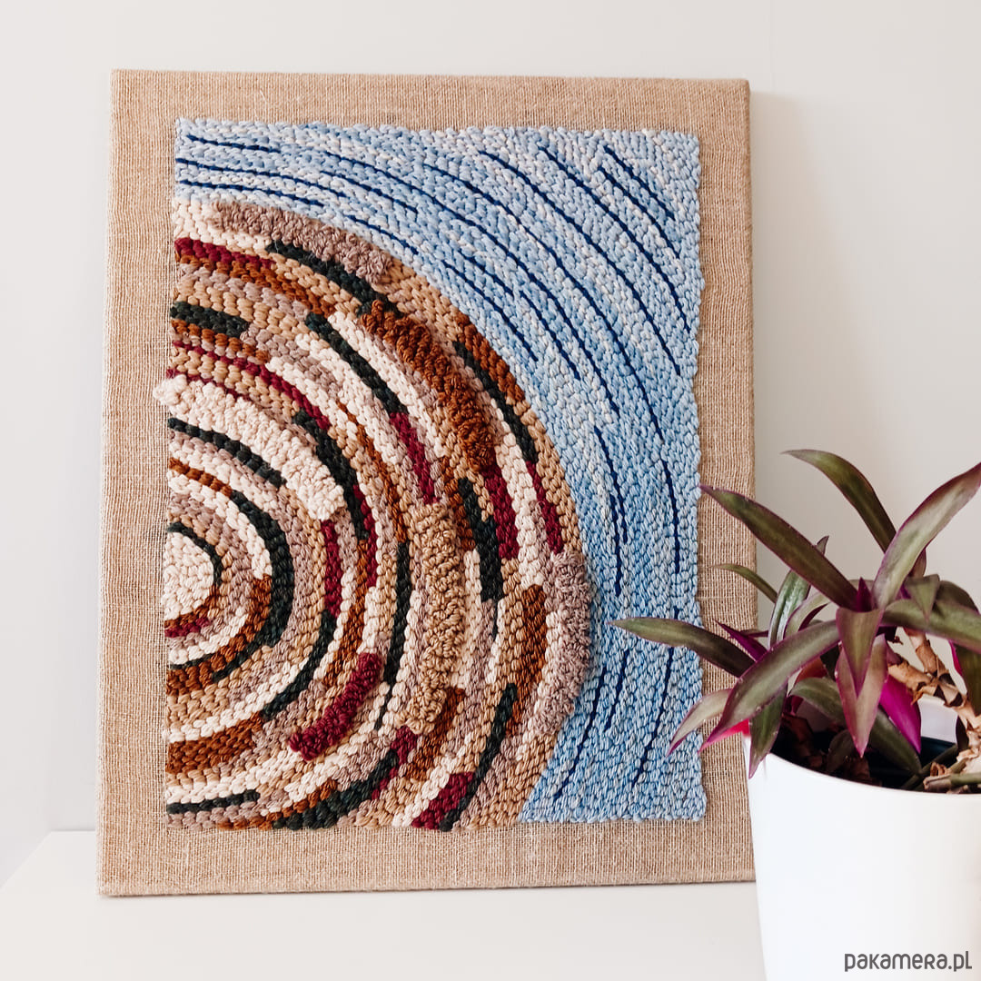 Autorski obraz wykonany techniką punch needle, który łączy w sobie rzemiosło i nowoczesną estetykę. Abstrakcyjny motyw w odcieniach beżu, brązu, czerwieni i błękitu przyciąga wzrok i wnosi do wnętrza harmonię oraz energię. Każdy detal został wykonany ręcznie z miękkiej, wełnianej włóczki na naturalnym lnianym podkładzie.