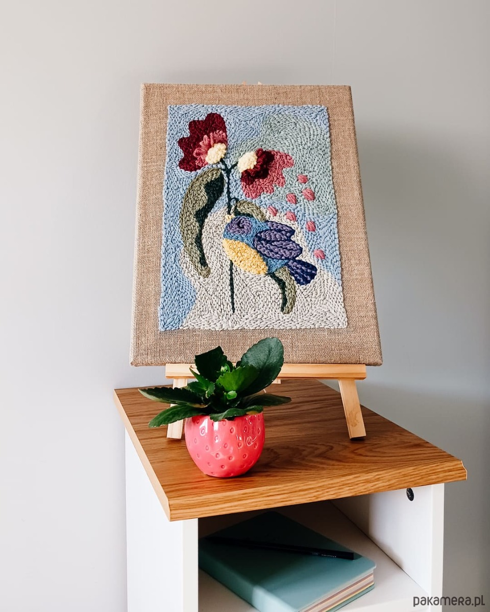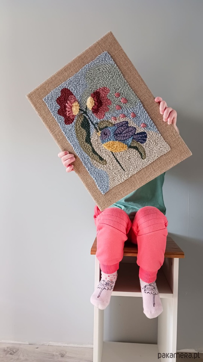 Wyjątkowy obraz tekstylny, wykonany w technice punch needle. Stworzony z myślą o pokoju małej dziewczynki lub chłopca. Pastelowe kolory, naturalne materiały i piękny motyw zaczerpnięty wprost z natury stworzy przytulny i bezpieczny świat. Świat dziecka nieprzeładowany plastikowymi dekoracjami.