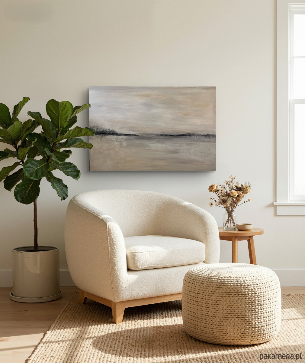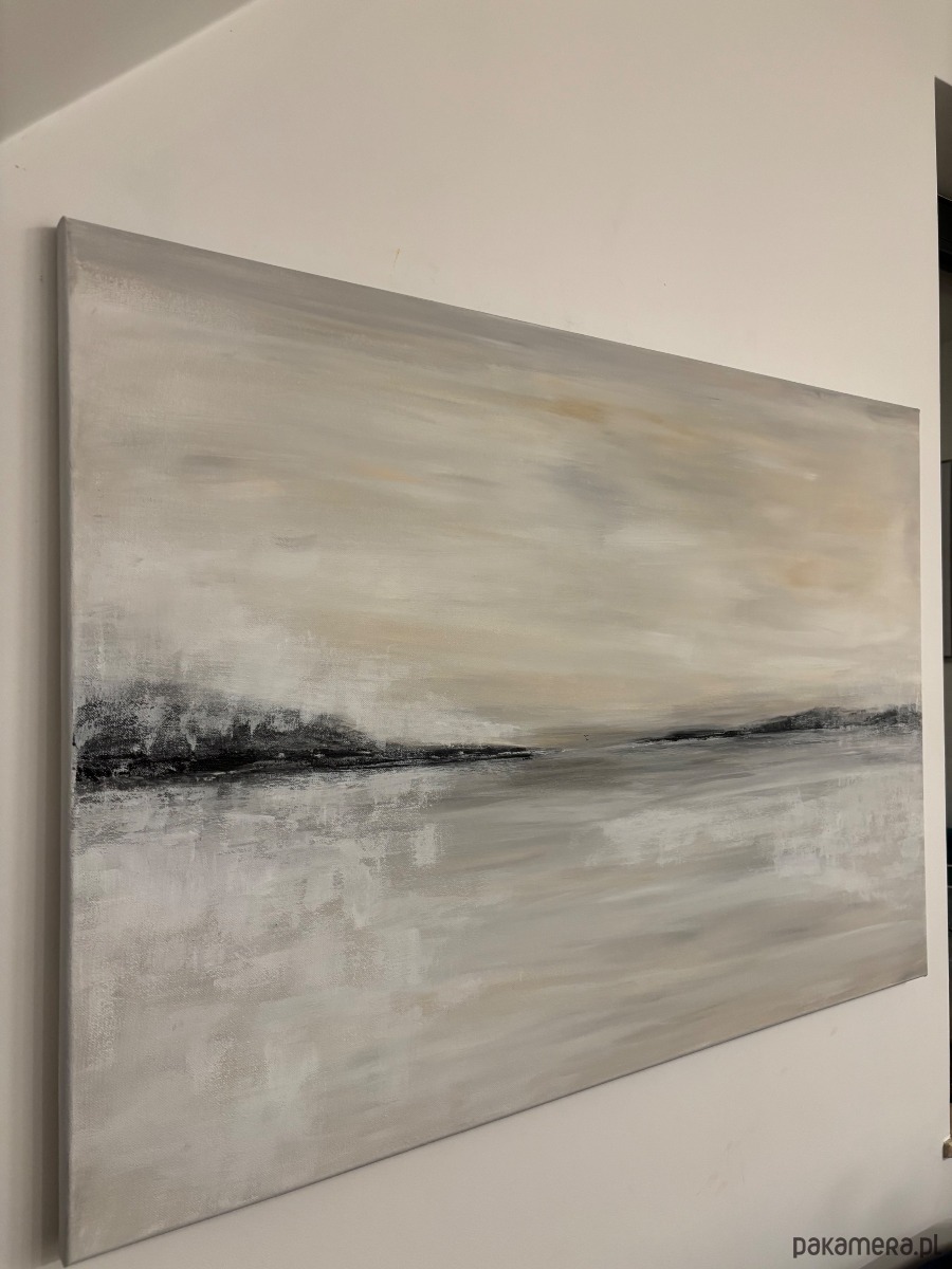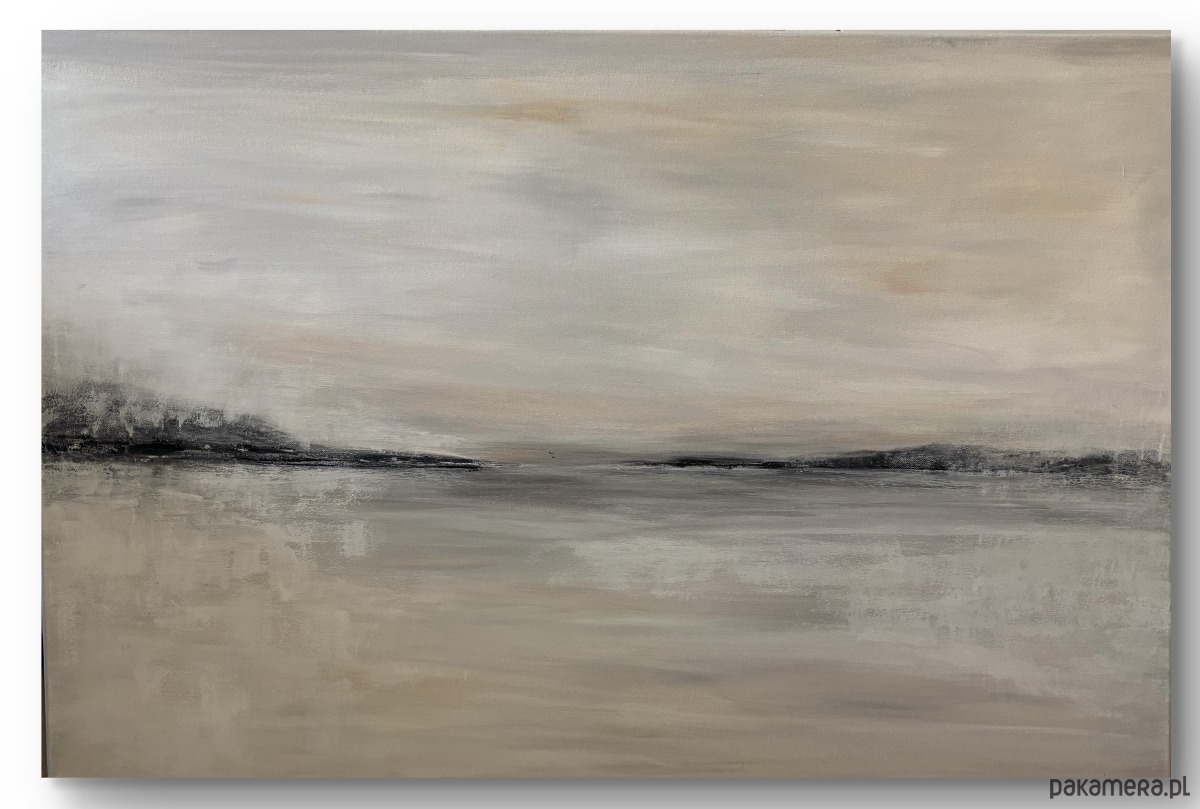 Obraz z serii „Etiuda” jest delikatny i subtelny, utrzymany w spokojnej, stonowanej palecie beżów, szarości i delikatnych czerni. Kompozycja przywołuje minimalistyczny pejzaż – linię horyzontu zarysowaną miękkimi, rozmytymi formami, które mogą przypominać odległe wzgórza lub brzeg jeziora. Subtelne przejścia i lekko rozmyta faktura budują atmosferę ciszy i przestrzeni.