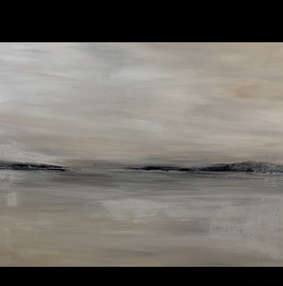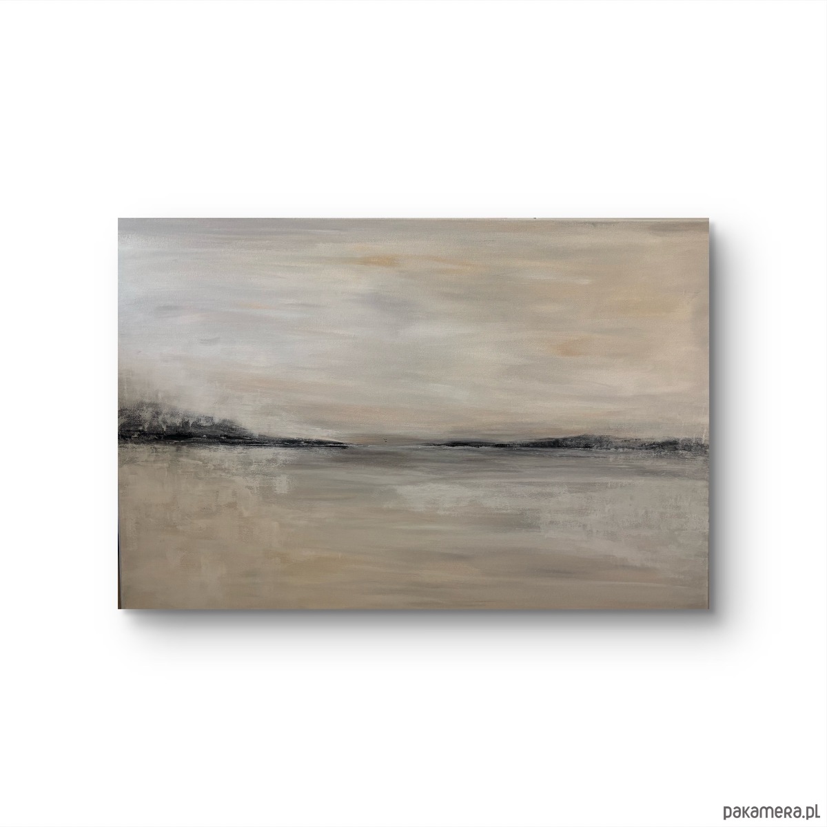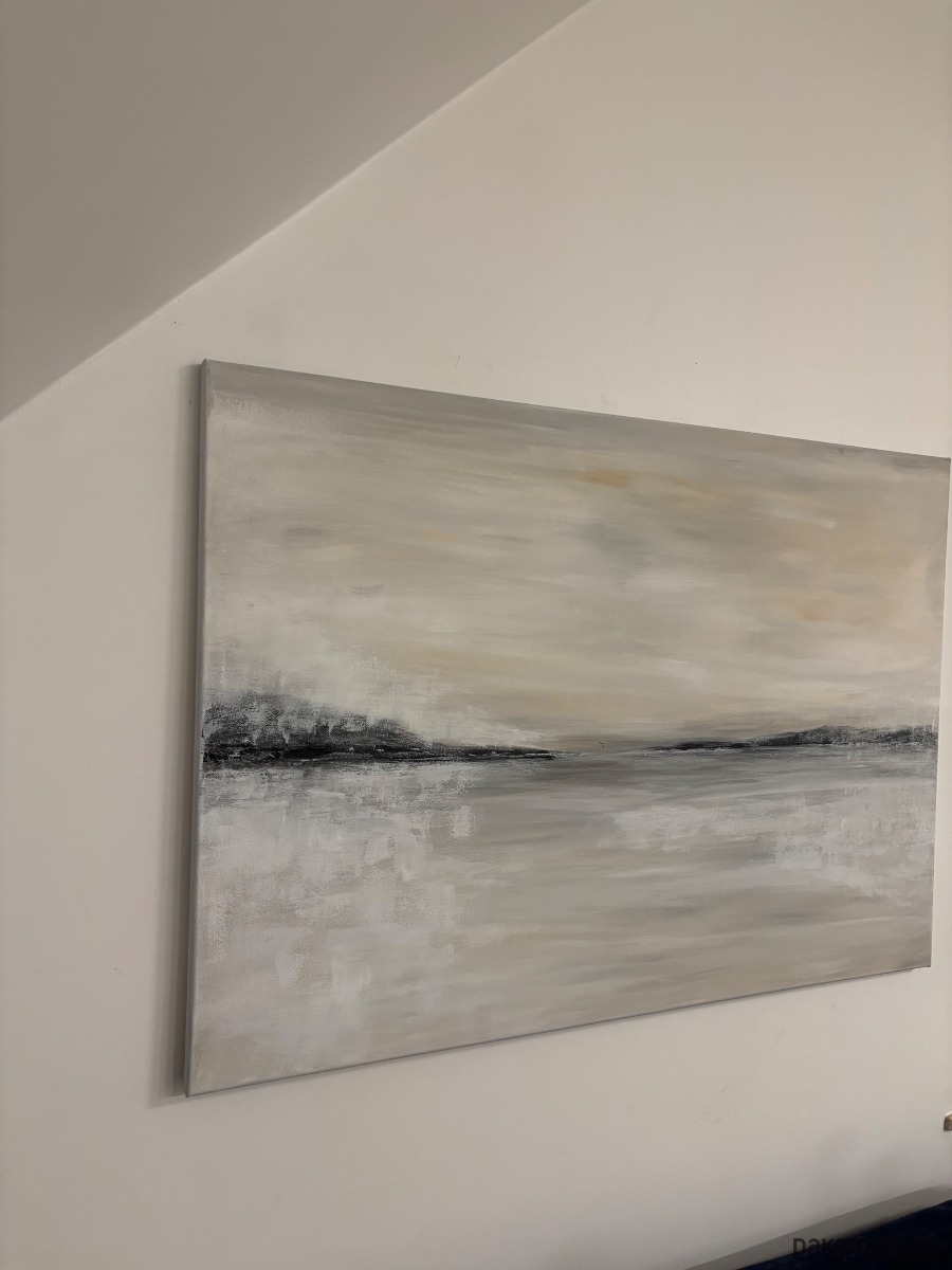 Obraz z serii „Etiuda” jest delikatny i subtelny, utrzymany w spokojnej, stonowanej palecie beżów, szarości i delikatnych czerni. Kompozycja przywołuje minimalistyczny pejzaż – linię horyzontu zarysowaną miękkimi, rozmytymi formami, które mogą przypominać odległe wzgórza lub brzeg jeziora. Subtelne przejścia i lekko rozmyta faktura budują atmosferę ciszy i przestrzeni.