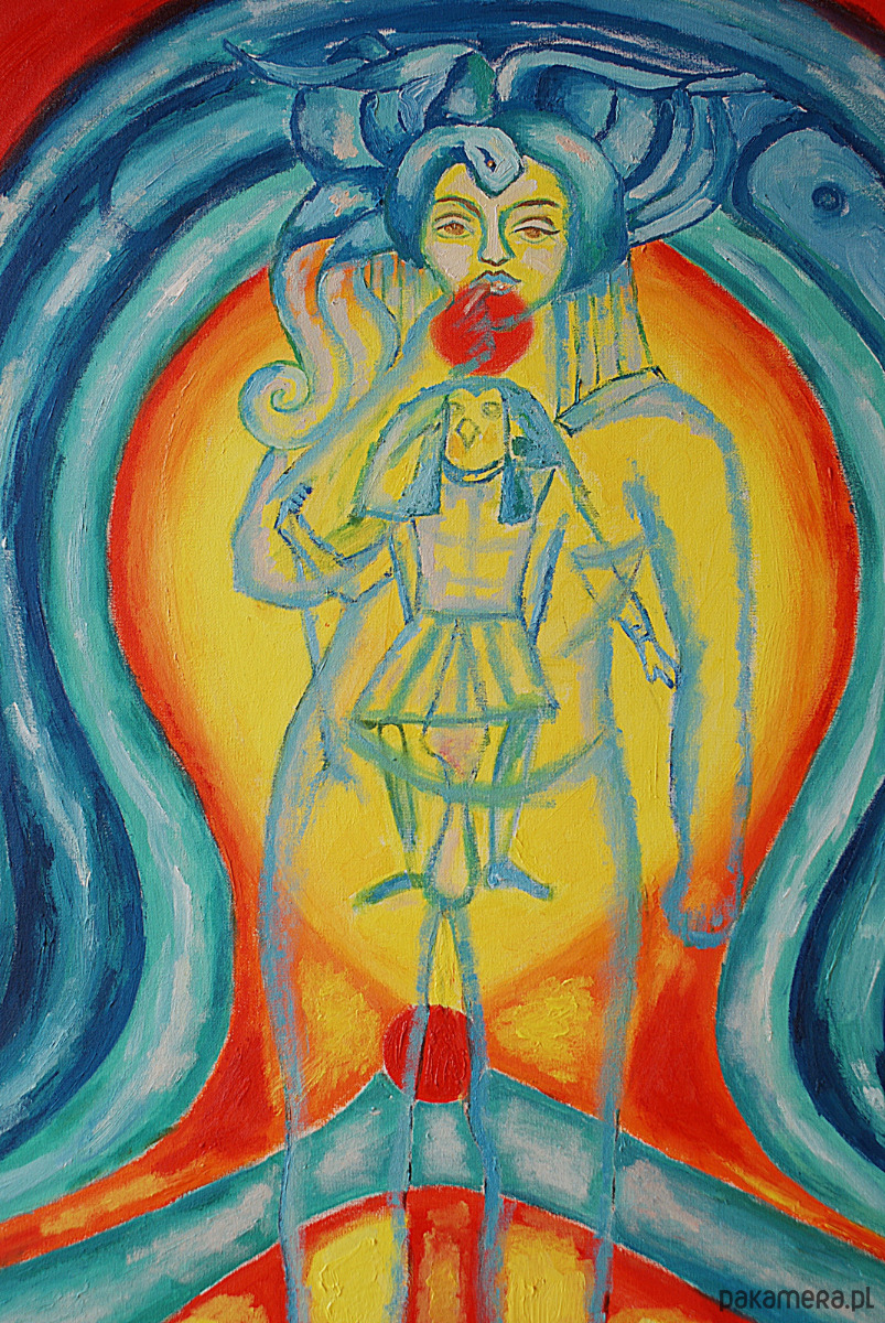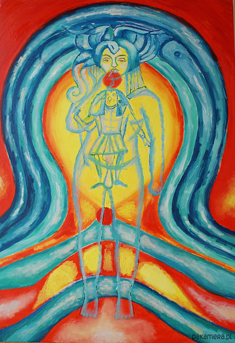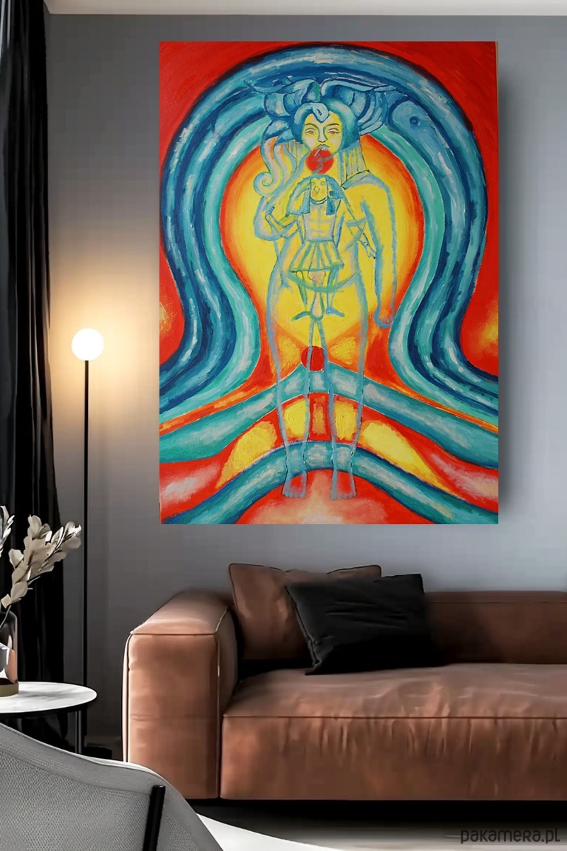 Obraz jest prawdziwą feerią barw, która wybucha intensywną czerwienią i żółcią w centrum, otoczoną falującymi niebiesko-zielonymi liniami. Centralna postać wygląda jakby była wpleciona w magiczny taniec. Jej twarz wyraża spokój, a może i zagadkowy uśmiech, jak Mona Lisa ale bardziej kolorowa. Kompozycja sugeruje równowagę, choć jest też pełna dynamicznych elementów. Artysta zastosował technikę grubych pociągnięć pędzla, co dodaje tekstury, a kolory prawie krzyczą do widza. To jak patrzenie na świat przez kalejdoskop.
