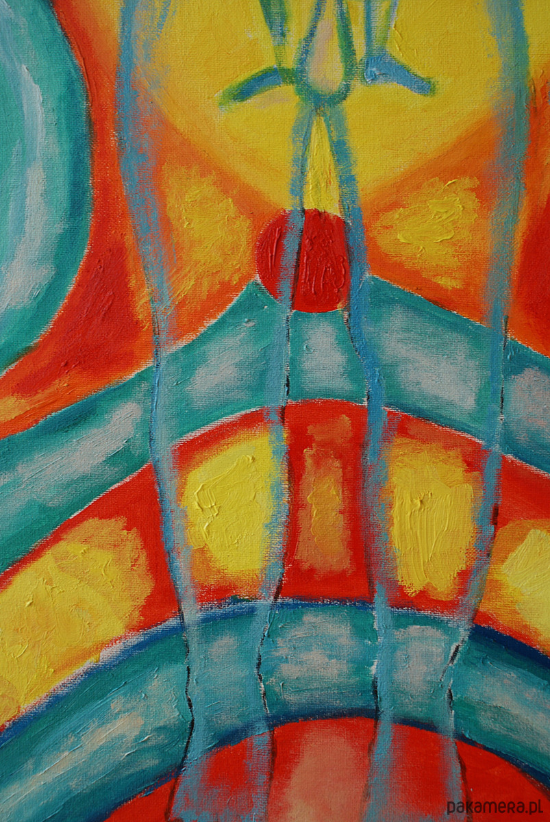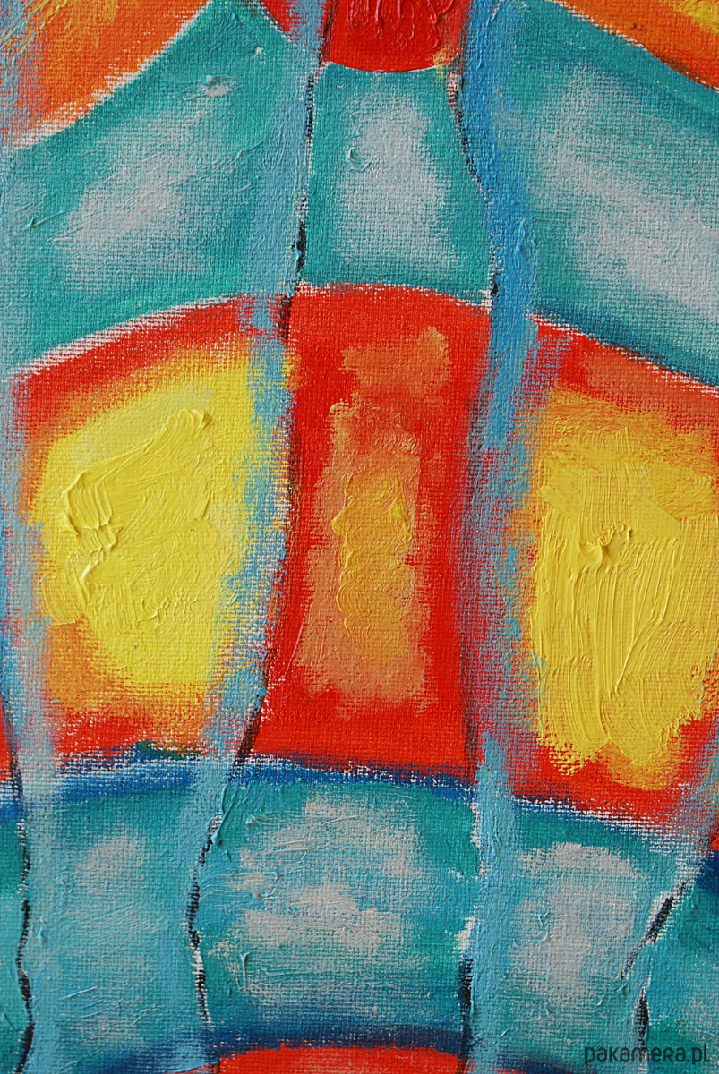Obraz namalowany techniką olejną na blejtramie o wymiarach: 100/70 cm, boki obrazu zamalowane, sygnowany z przodu. Jest to moja autorska kompozycja. Świetnie może być eksponowany w nowoczesnych wnętrzach o stonowanej kolorystyce. Swoimi barwami może rozjaśnić takie wnętrza, w oświetleniu dziennym, jak i sztucznym. Polecany dla miłośników ekspresji i nie tylko.