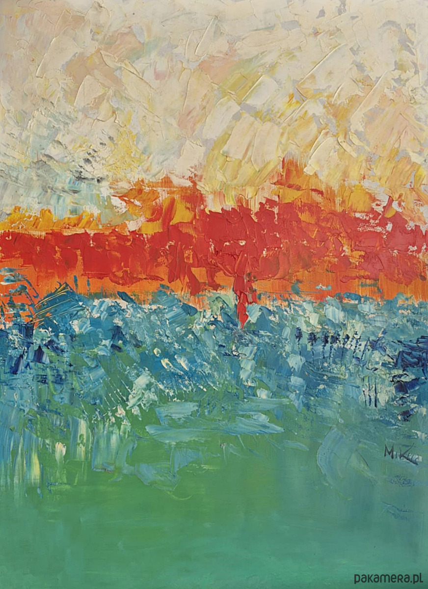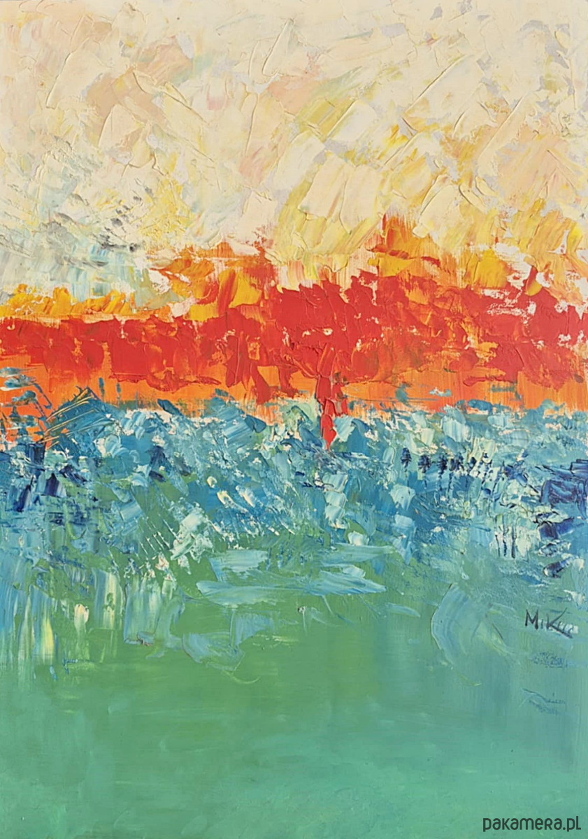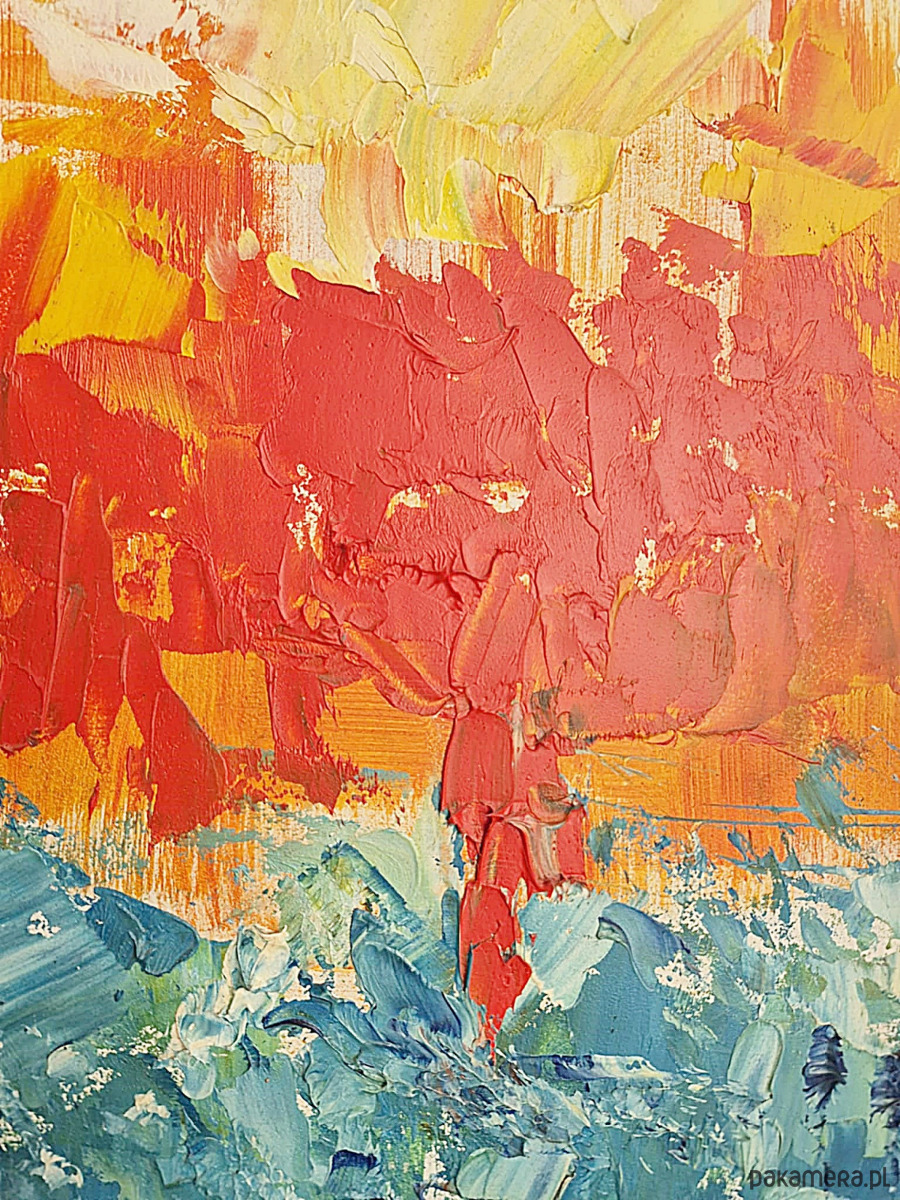 Praca wykonana jest farbami olejnymi na płycie o wymiarach: 50/70 cm. Obraz wymaga oprawy, jest sygnowany z przodu znakiem autorskim. Praca ukazuje abstrakcje o nasyconych barwach. Obrazy w stylu nowoczesnym sprawdzą się zarówno w eleganckim salonie jak i biurze ich forma sprawia, że są uniwersalne i pasują do wielu wnętrz.