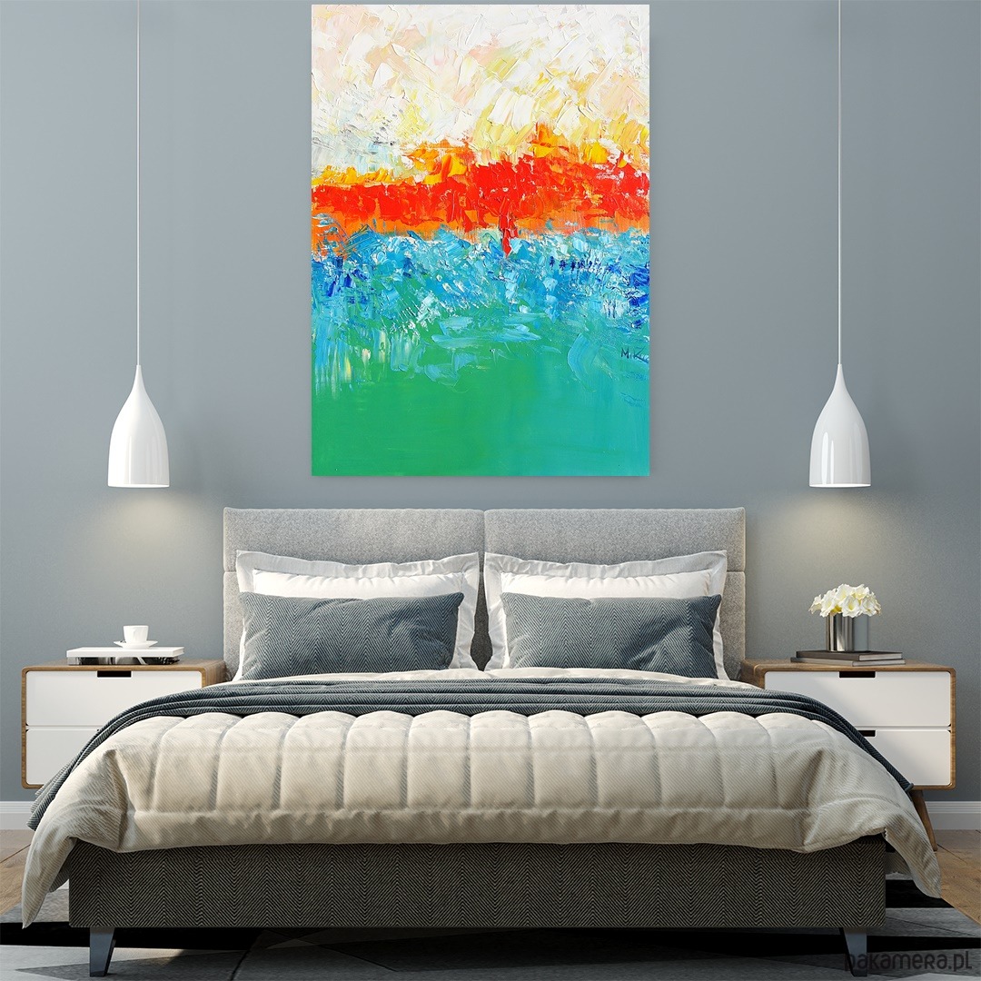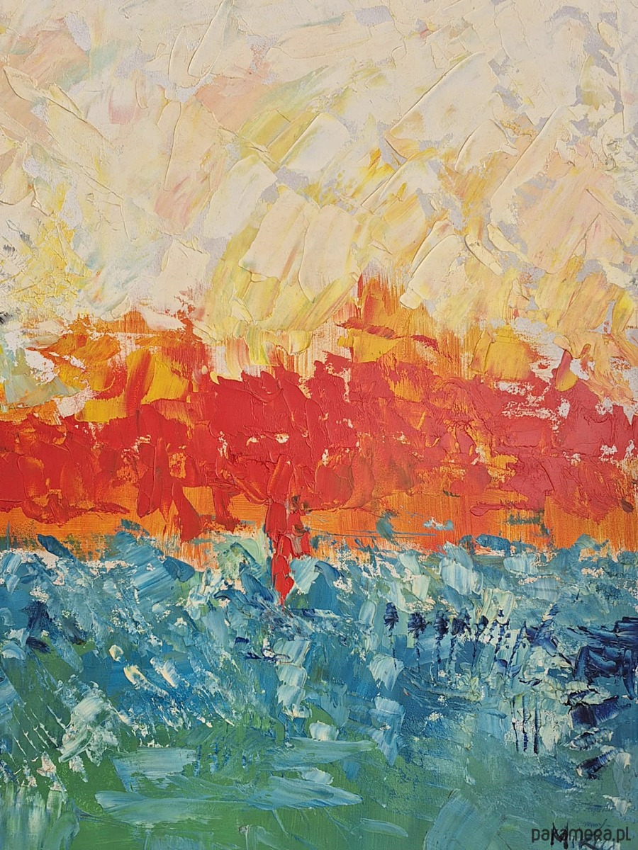 Kompozycja opiera się na wyraźnym podziale poziomym. Środek przecina intensywny pas czerwieni i pomarańczu – wygląda jak rozgrzany horyzont, coś między zachodem słońca a linią ognia. Ten fragment przyciąga wzrok natychmiast – jest najbardziej nasycony, najbardziej energetyczny.