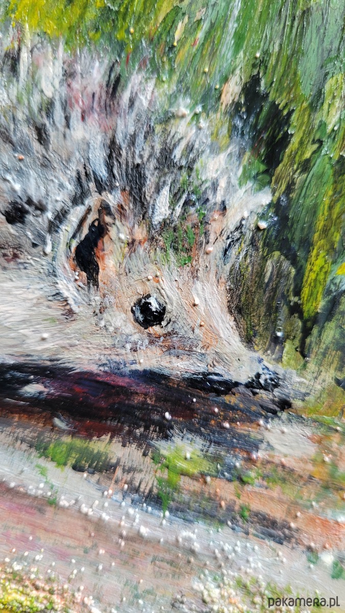 Obraz ręcznie malowany, wykonany farbami akrylowymi; na grubym kartonie.
