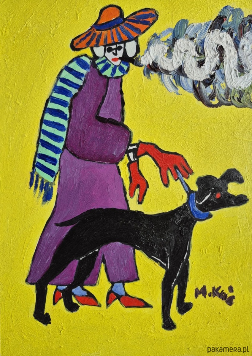 Obok niej znajduje się czarny pies o wydłużonej sylwetce, prowadzony na smyczy. Jego ciało jest niemal graficzne – płaskie, mocno obrysowane konturem. Czerwone detale (dłonie kobiety, buty, oko psa) wprowadzają rytm i lekki niepokój, jakby obraz balansował między codzienną sceną a czymś surrealnym.