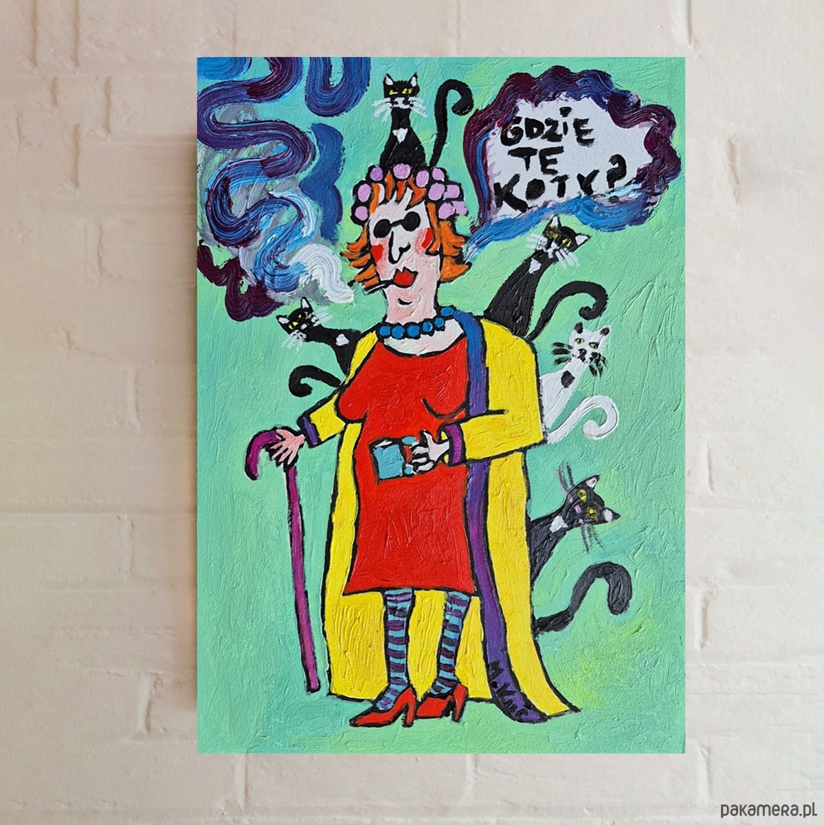 Kobieta pali papierosa, a unoszące się z niego dymy mają barwy fioletu i błękitu, jakby były malowane ruchem pędzla zanurzonego w fantazji. Z chmury dymu wyłania się napis: „Gdzie te koty?” – ironiczny, bo przecież kotów jest tu całe stado. Napis wzmocniony ekspresyjnym, surowym liternictwem dodaje całości komiksowego charakteru.