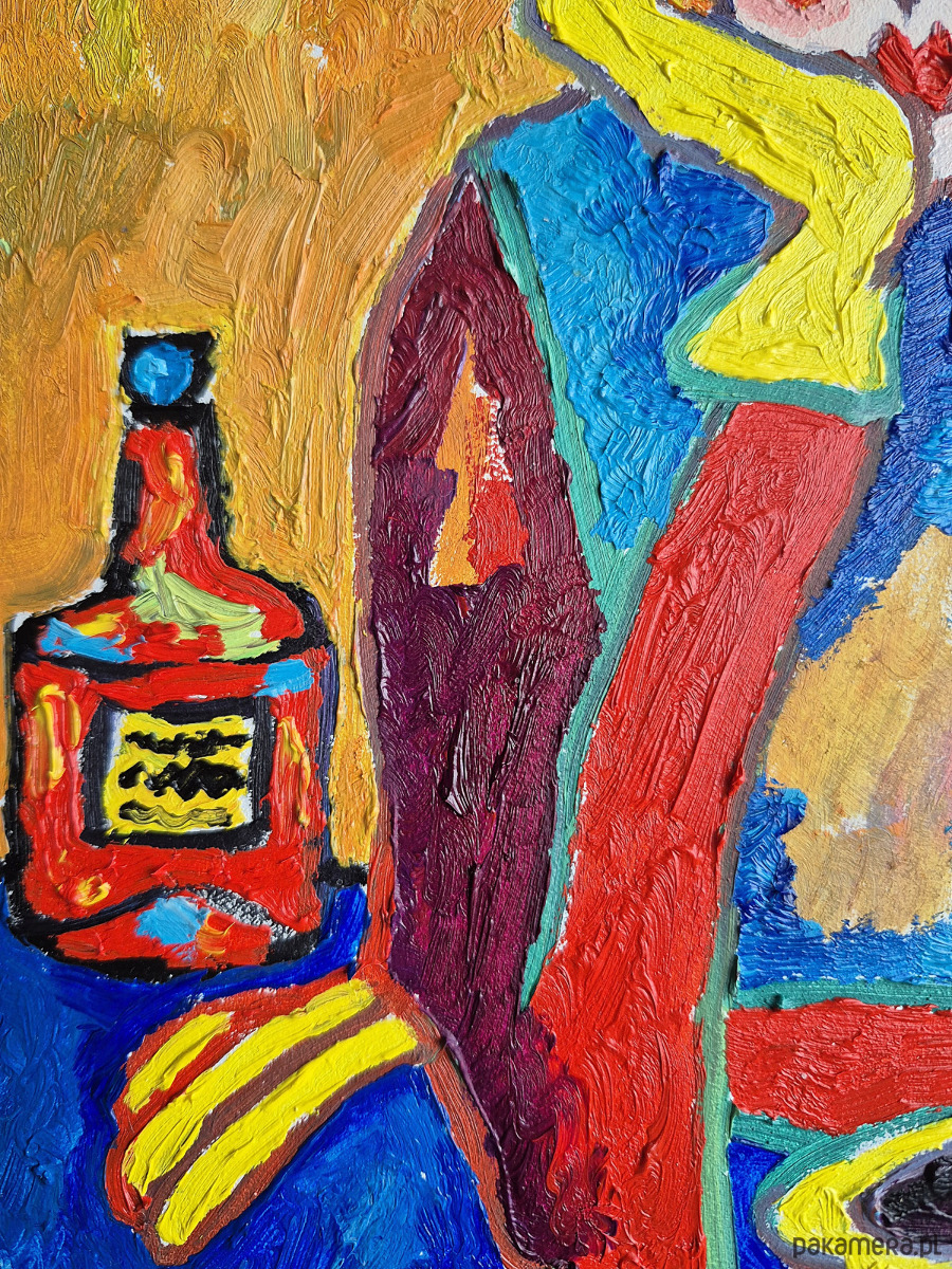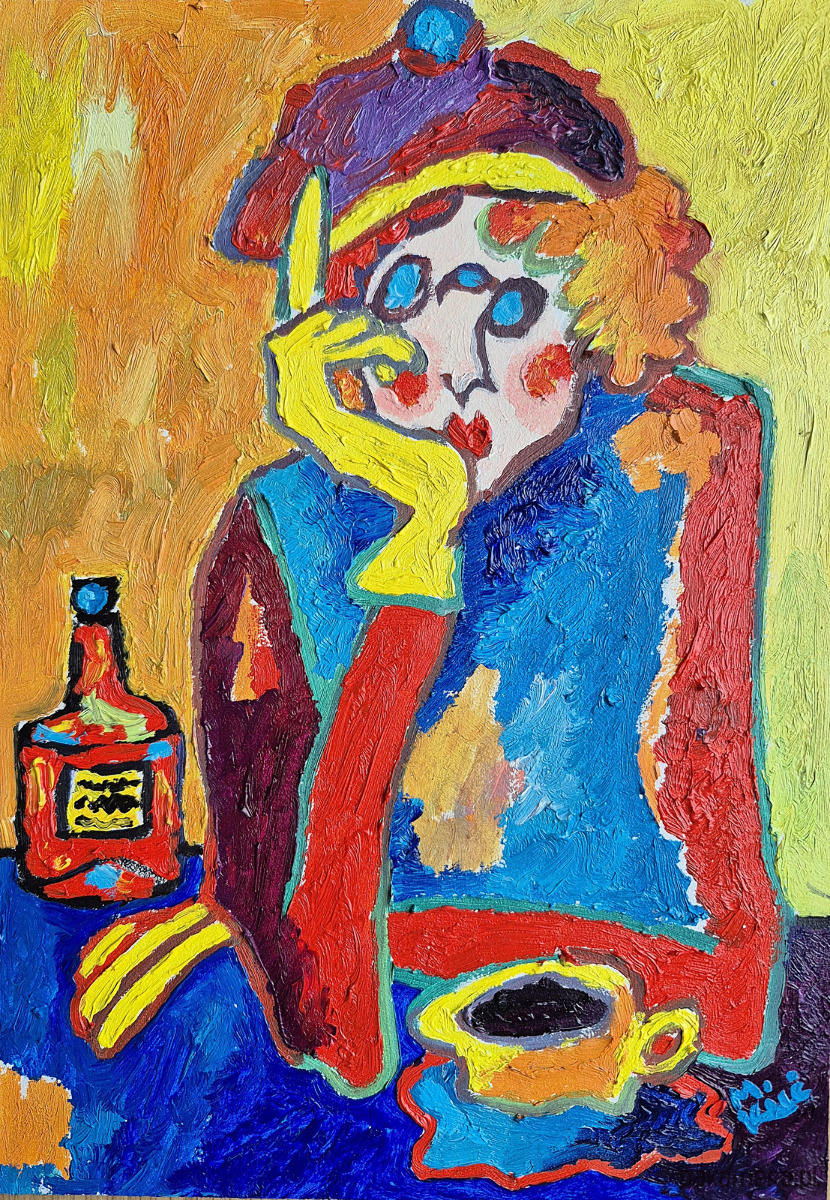 Na obrazie pulsuje świat zbudowany z barw, które nie znają ciszy. Postać siedzi przy stole jak zagubiony wędrowiec w krainie snów, a jej twarz — rozpuszczona w plamach czerwieni, błękitu i różu — przypomina maskę noszoną z lekkim uśmiechem i odrobiną rezygnacji.