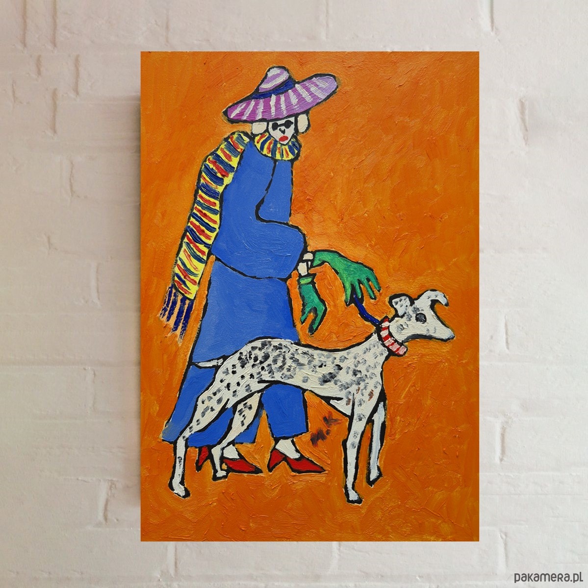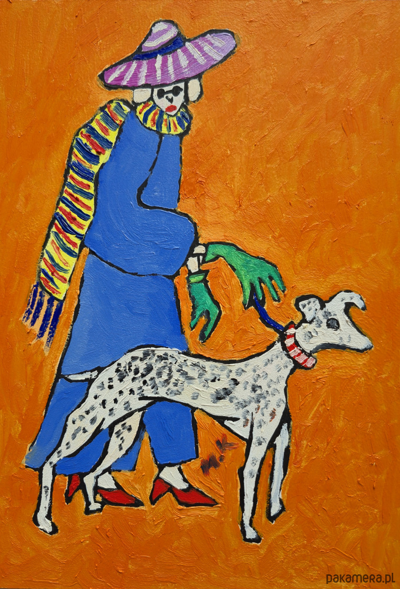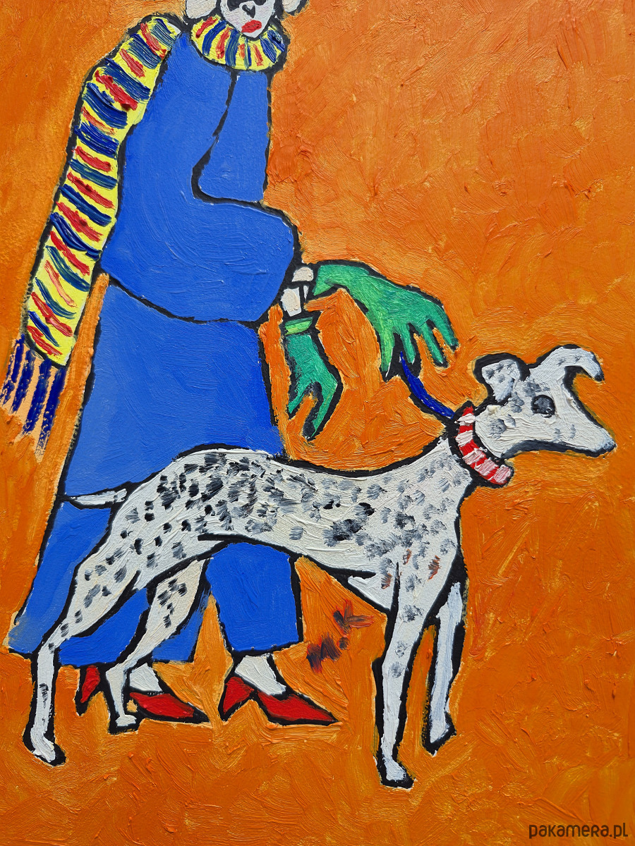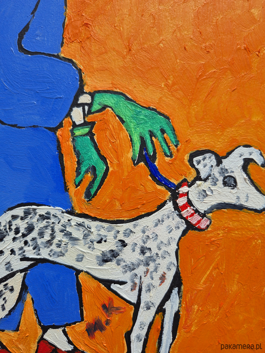 Obraz tętni kolorami: intensywny pomarańcz tła kontrastuje z błękitem postaci, zielenią rąk i bielą psa. Fioletowy kapelusz i pasiasty szalik dodają całości nieco szaleństwa. Kompozycja jest nieco chaotyczna, ale w dobry sposób! Kształty są uproszczone, jakieś takie kanciaste, co nadaje dziełu abstrakcyjnej nuty. Artysta posłużył się techniką grubo kładzionej farby, co widać po fakturze tła. Jasne, wyraziste kolory wzbudzają we mnie poczucie radości i optymizmu.