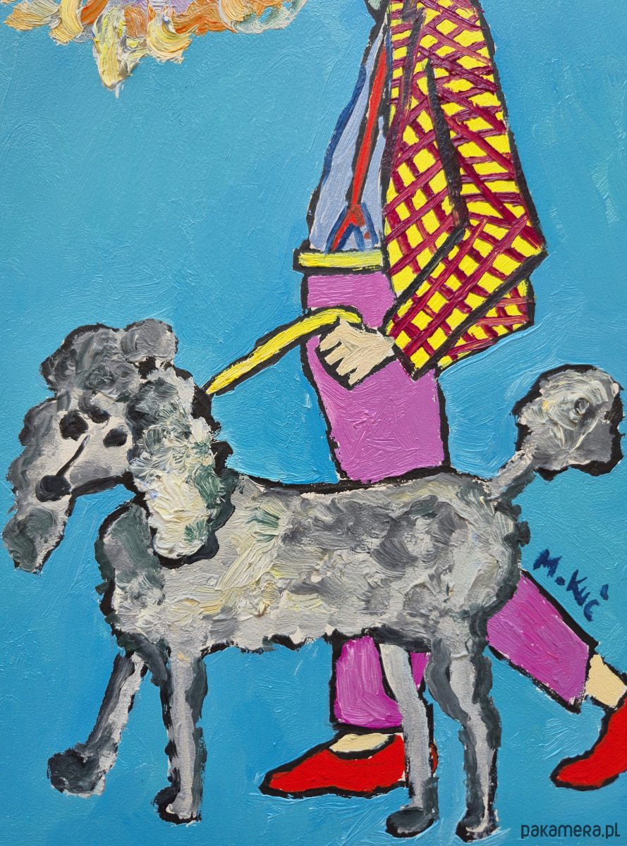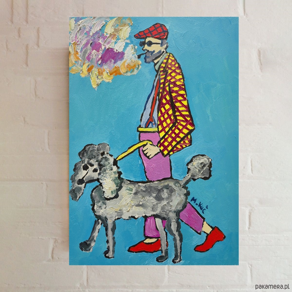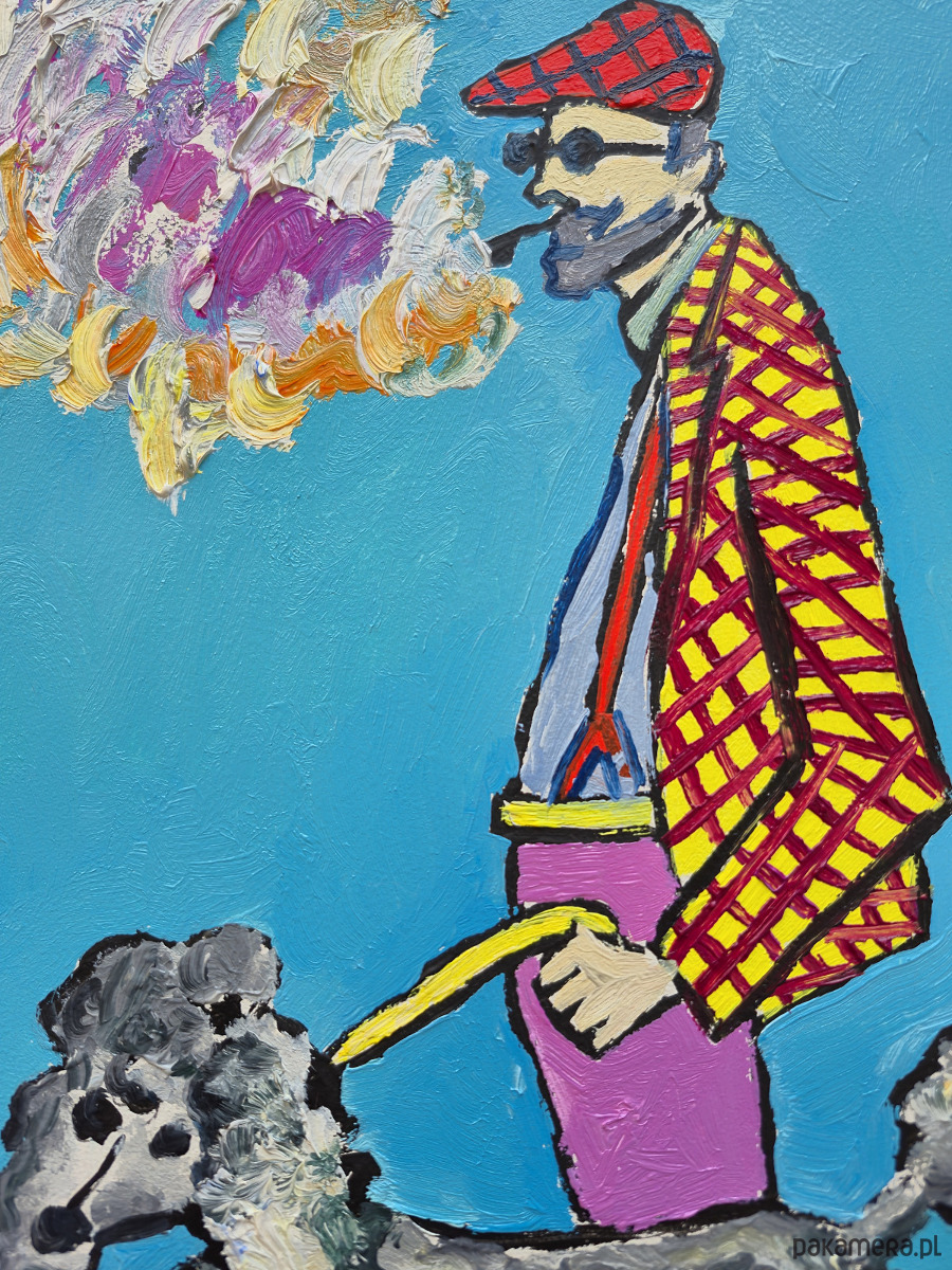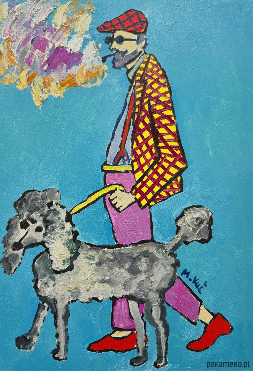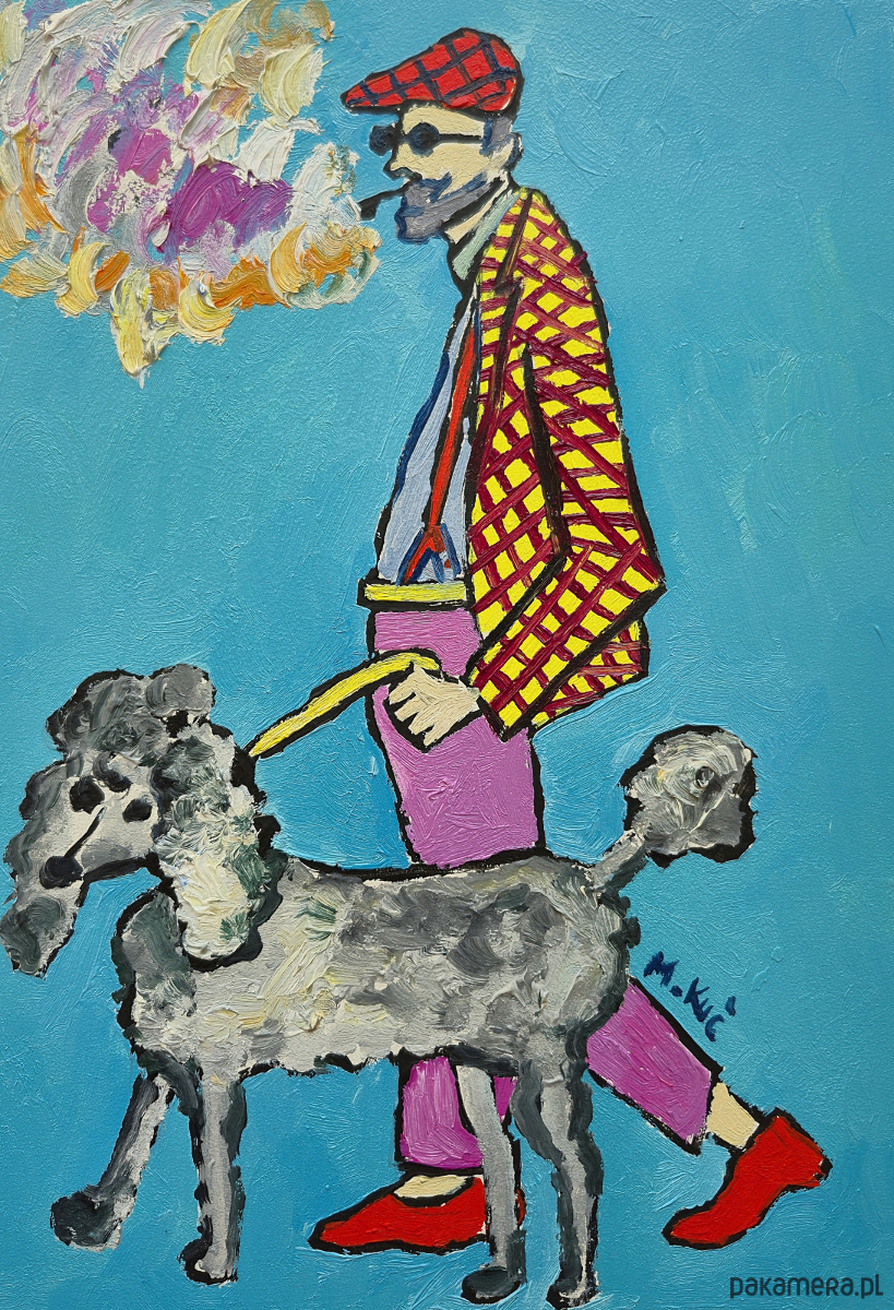 Styl przypomina trochę naiv art z elementami Fowizmu, ale może się mylę. Obraz wywołuje uśmiech na twarzy. Kojarzy mi się z bajką, bo dziadek z psem wyglądają jak postacie z fantastycznego świata.