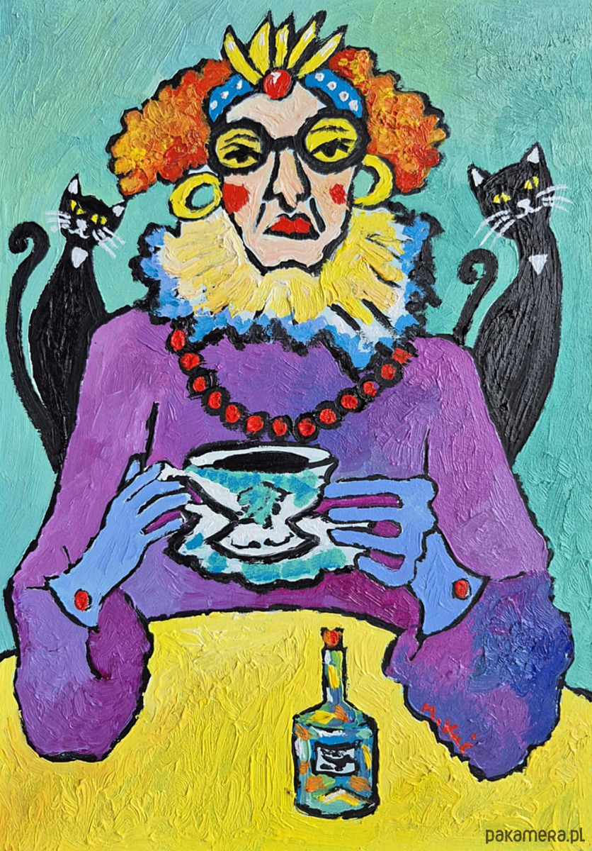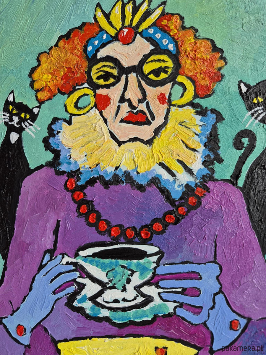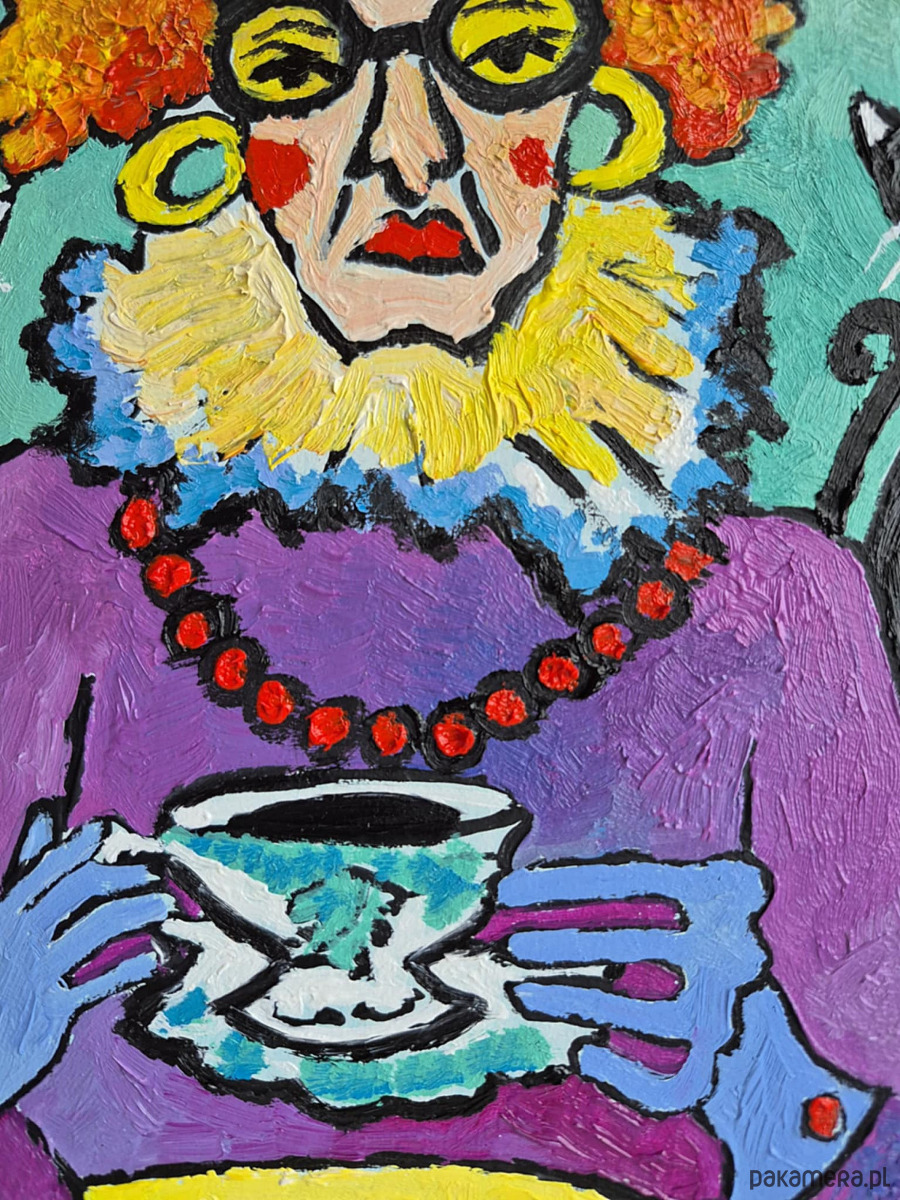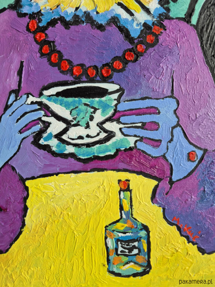 Na tym obrazie króluje postać, która wygląda jak ekscentryczna monarchini własnych myśli — jakby codzienny rytuał picia kawy stał się ceremonią o randze dworskiej. Jej sylwetka jest monumentalna, pełna barwnego przepychu, a równocześnie karykaturalna, jakby żyła w świecie, gdzie ironia i elegancja przeplatają się na każdym kroku.
