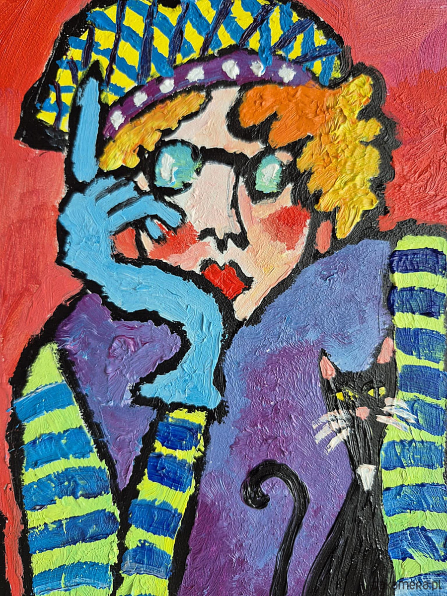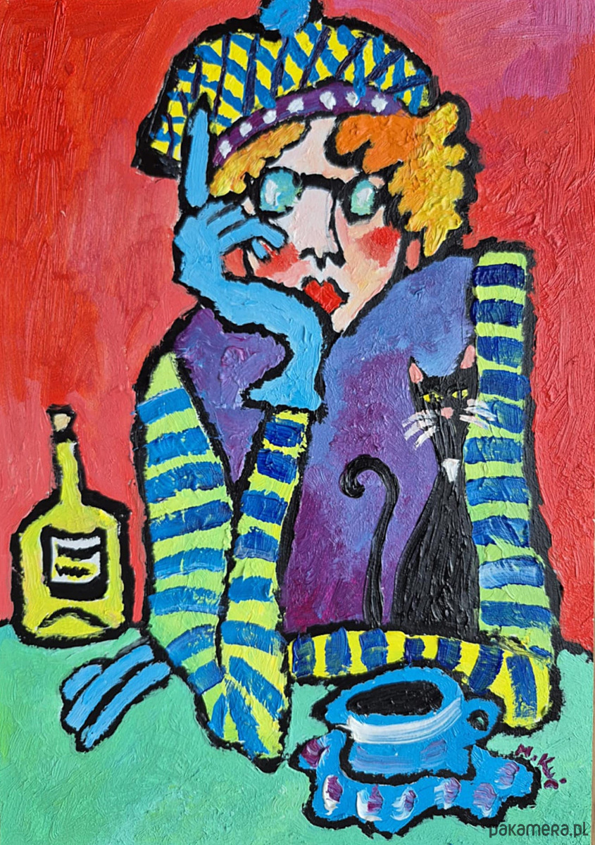 Ten obraz pulsuje energią koloru i ekspresji — jakby został namalowany jednym, długim oddechem pełnym emocji. Postać siedząca przy stole wydaje się zawieszona między zadumą a lekkim znużeniem, a jej niebieskie dłonie i pasiasty ubiór nadają jej niemal teatralny charakter. Twarz, z rumieńcami i wyrazistymi ustami, jest jak odbicie wewnętrznego dialogu: ironii, nostalgii, może odrobiny rozbawienia.