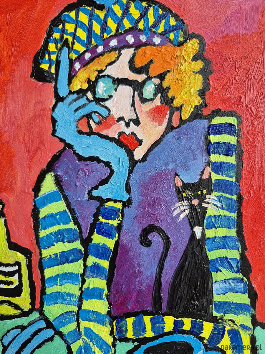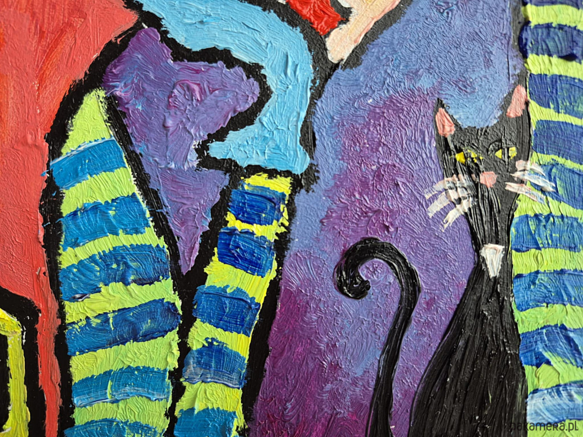 Czarne, eleganckie kocisko u jej ramienia działa jak cichy towarzysz – jego delikatne wąsy i skręcony ogon kontrastują z odważnymi, mocnymi liniami reszty kompozycji. Wygląda, jakby pilnowało tej osobliwej chwili zawieszonej w czasie.