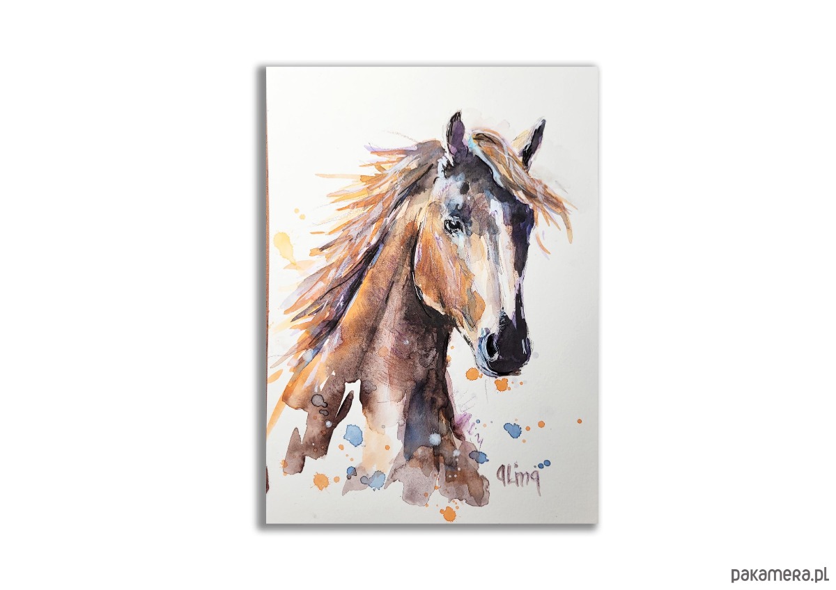 Obraz ręcznie malowany, wykonany w technice mieszanej; na białym, wysokogatunkowym papierze.