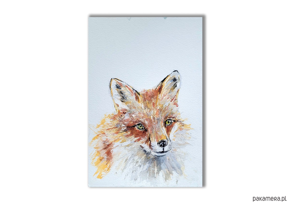 Obraz ręcznie malowany, wykonany w technice mieszanej; na białym, wysokogatunkowym papierze.