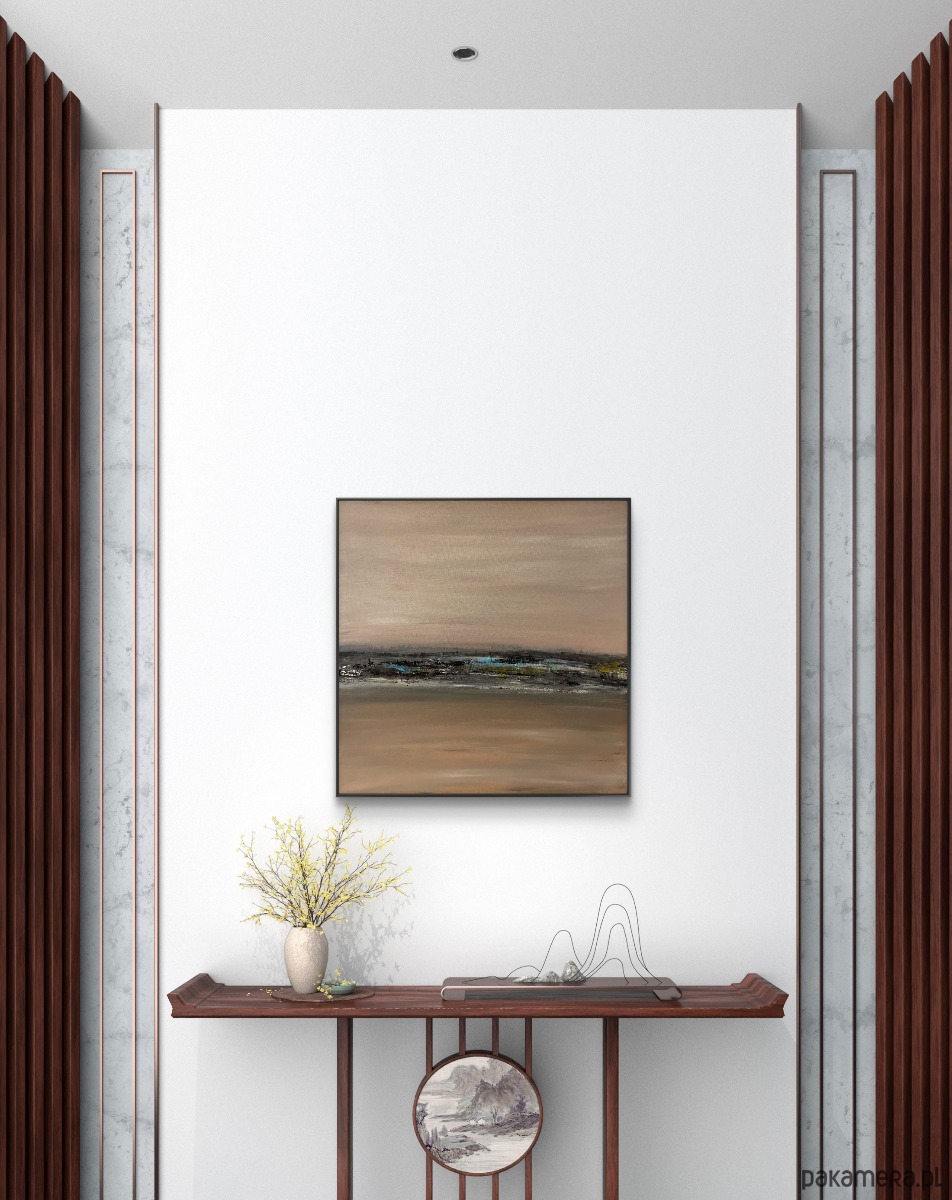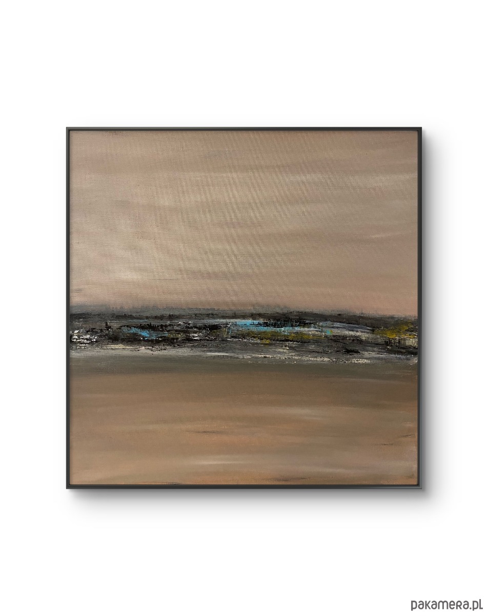 Obraz z autorskiej serii „Tonacja”pt. „Z bliska”, utrzymany w subtelnej, stonowanej palecie barw. Delikatne przejścia beży, szarości i przygaszonych różów tworzą spokojny, minimalistyczny pejzaż o lekko impresyjnym charakterze. Centralny horyzont z fakturalnymi akcentami nadaje kompozycji głębi i nowoczesnej elegancji.