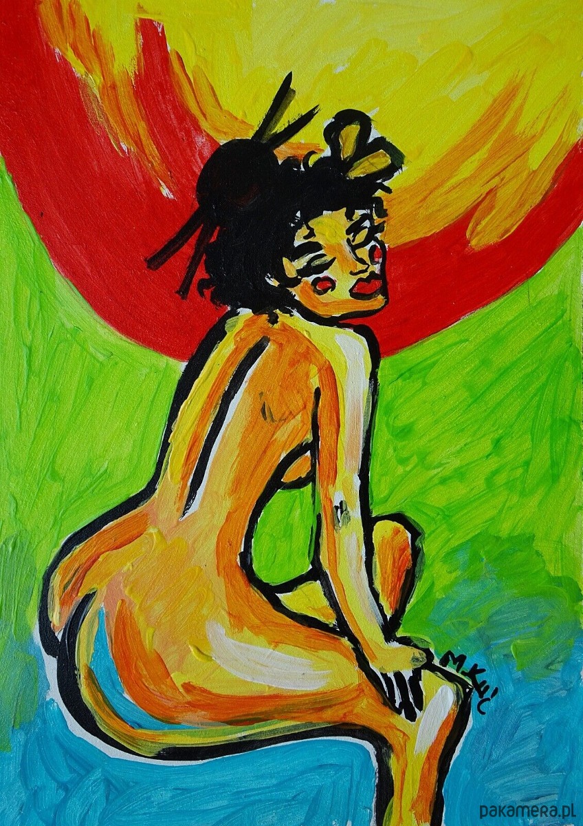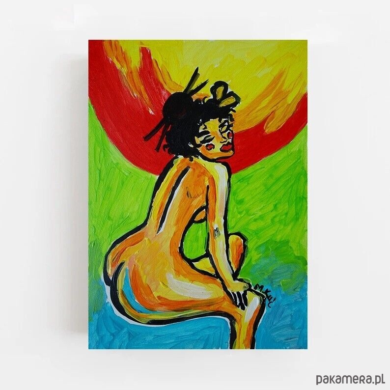 Obraz emanuje energią dzięki intensywnym kolorom. W centrum widzimy postać kobiety otoczoną jaskrawą paletą barw. Tło to mieszanka czerwieni, zieleni i żółci, które tworzą dynamiczny kontrast z niebieską podłogą - to jak żywy obraz lata. Artysta użył grubych, wyrazistych pociągnięć pędzla, co nadaje dziełu surowości i spontaniczności. Styl przypomina ekspresjonizm, gdzie emocje dominują nad realizmem. Kobieta na obrazie wydaje się pewna siebie, a jej wyraz twarzy jest pełen tajemnicy i zadumy. Może to ktoś, kto marzy? Albo po prostu odpoczywa. Nastrój obrazu jest nieco zadziorny, a może trochę nostalgic? Emocje są prawdziwe, niemal namacalne. To dzieło wywołuje uśmiech i skłania do refleksji. Patrząc na nie, wydaje się, że można poczuć ciepło letniego słońca
