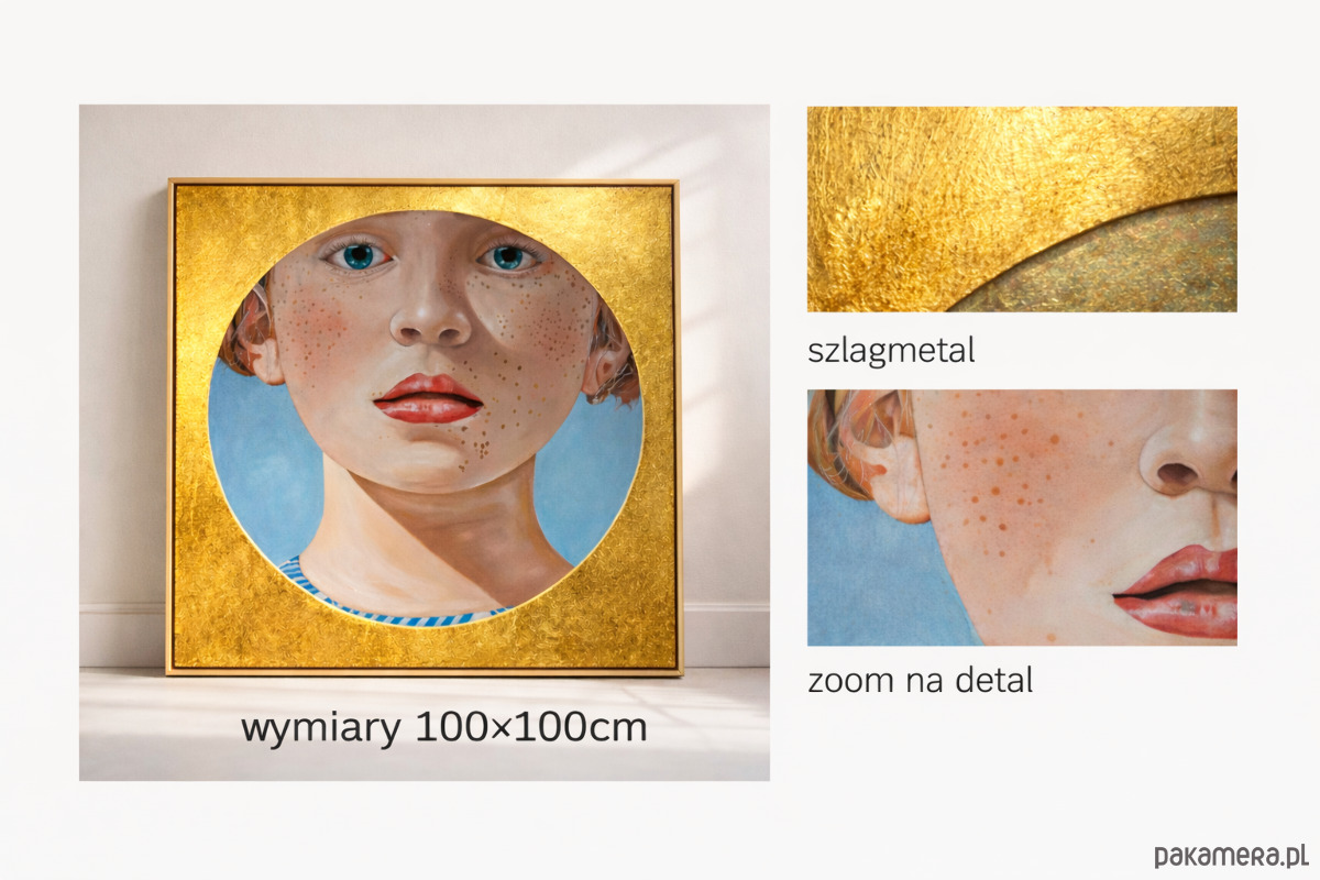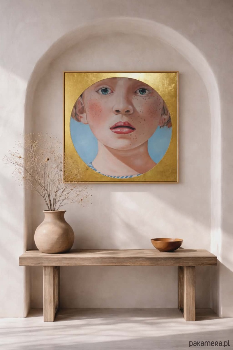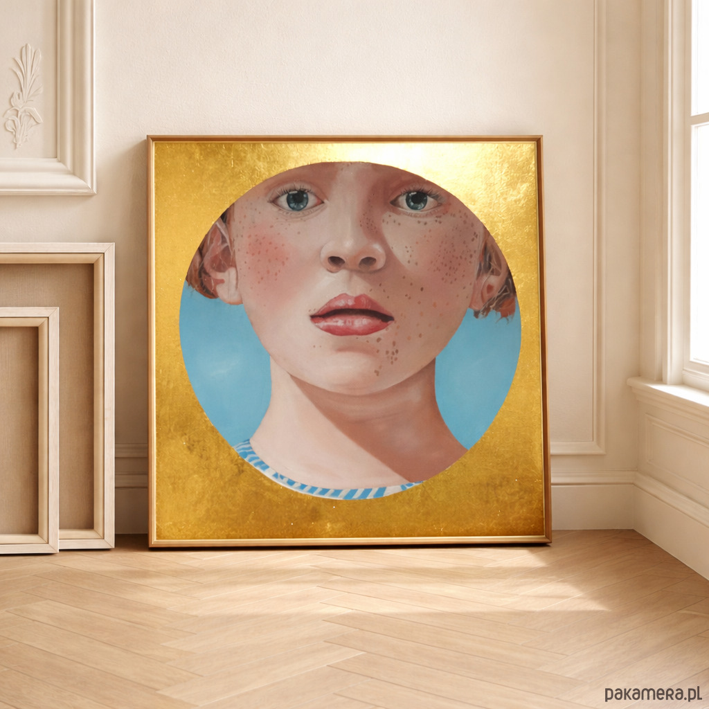 Ten obraz olejny pracuje ze światłem w sposób, którego nie da się podrobić. Złote tło nie jest płaskie reaguje na każdy promień, subtelnie odbijając i rozpraszając światło we wnętrzu. W zestawieniu z miękko malowaną skórą i naturalnymi piegami powstaje napięcie między delikatnością a materią.