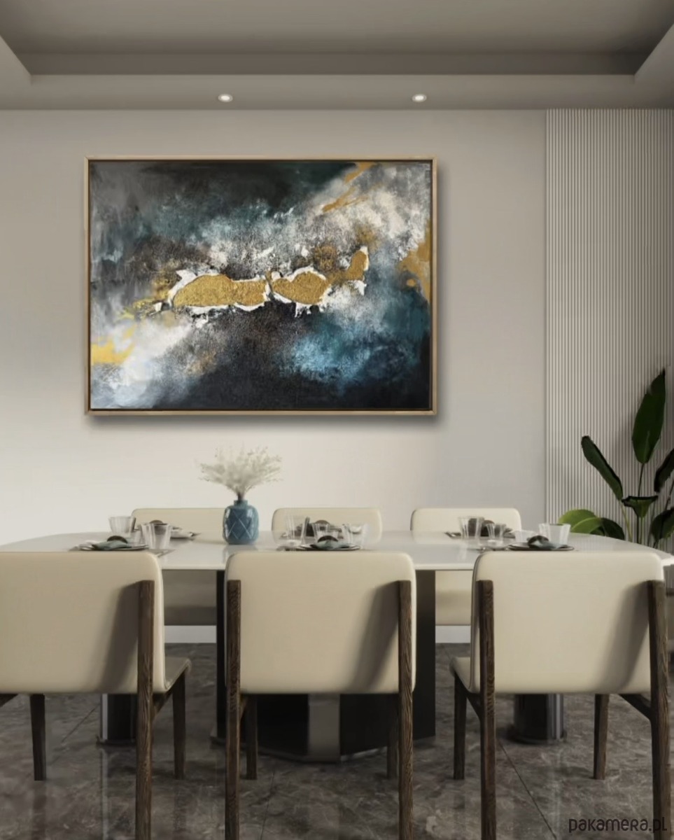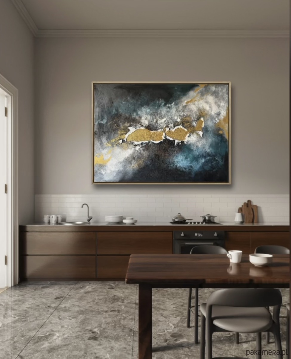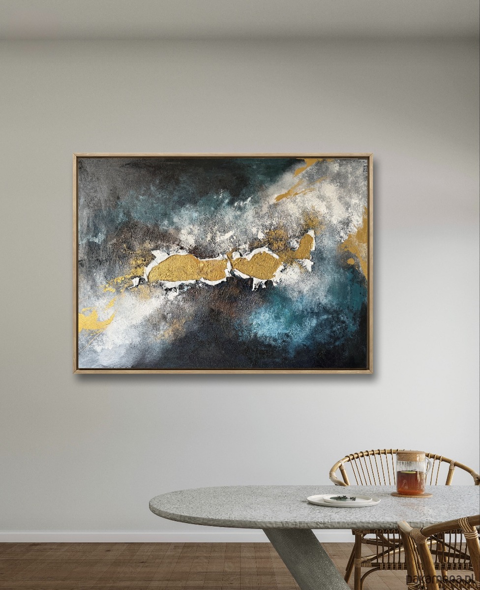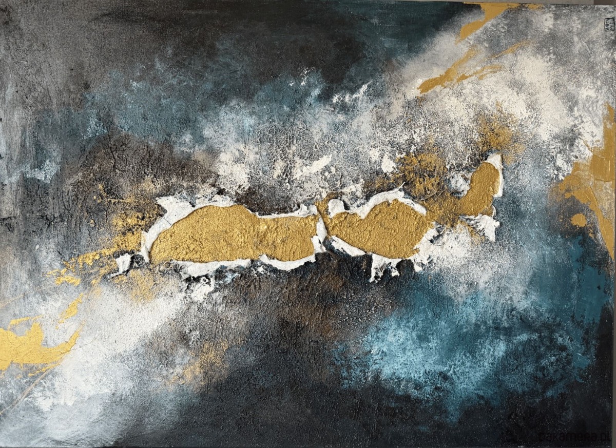 Złoto wyłania się z serca kompozycji z wyjątkową siłą : jako symbol odrodzenia, nadziei i wewnętrznej jasności. Wokół niego czernie, biele, błękity i turkusy stapiają się w emocjonalną atmosferę przywodzącą na myśl morze: burzę, która właśnie mija, i spokój, który przychodzi po niej.