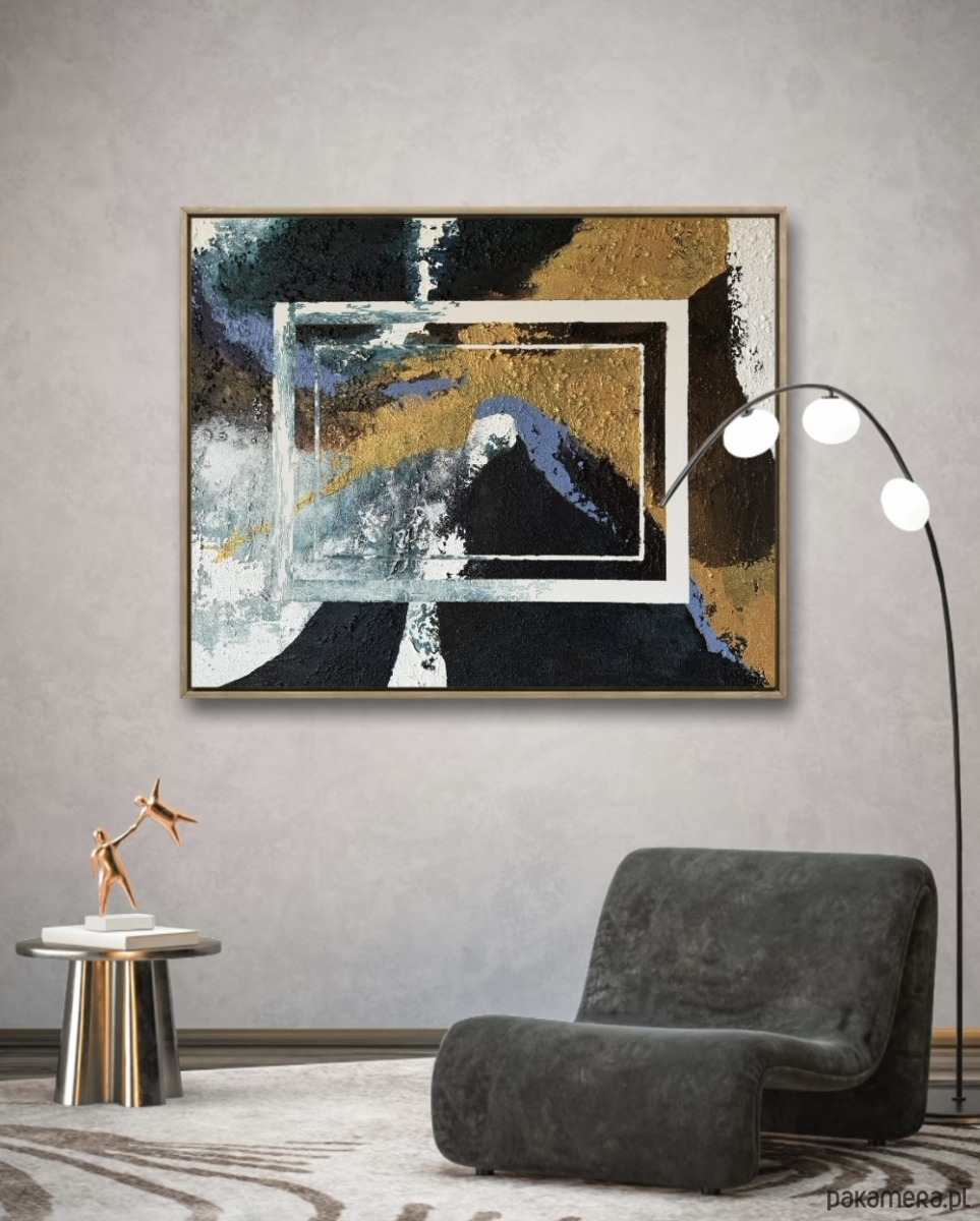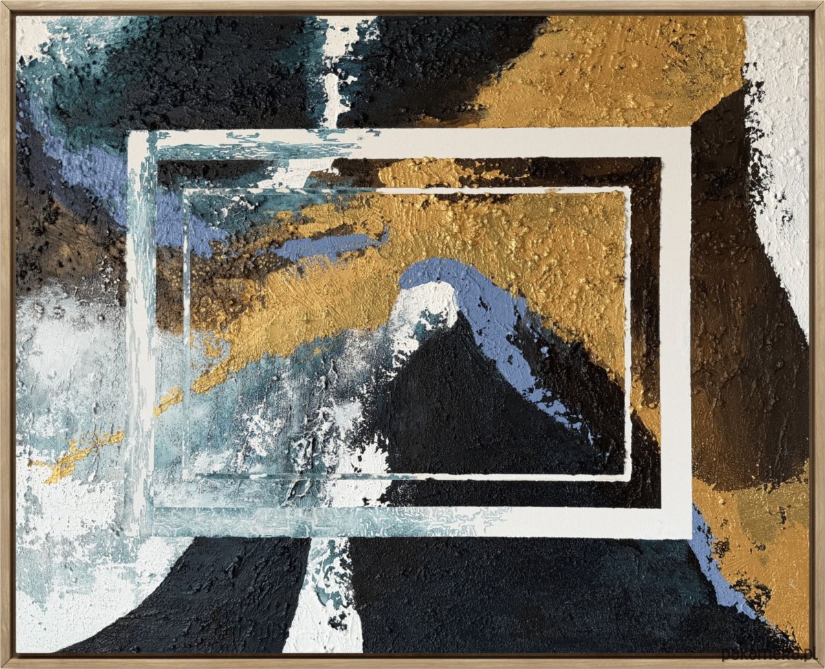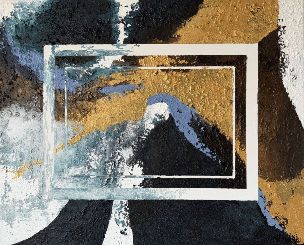 Złote, niebieskie, czarne i białe tony spotykają się i przenikają niczym uczucia, które zderzają się ze sobą, płyną i nieustannie się zmieniają. Prostokątne, kadrujące formy otwierają nowe przestrzenie - jak zaproszenie do przekroczenia granicy, spojrzenia dalej i poddania się temu, co nieoczekiwane.