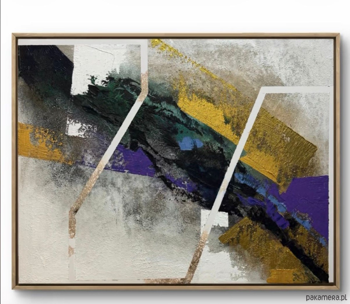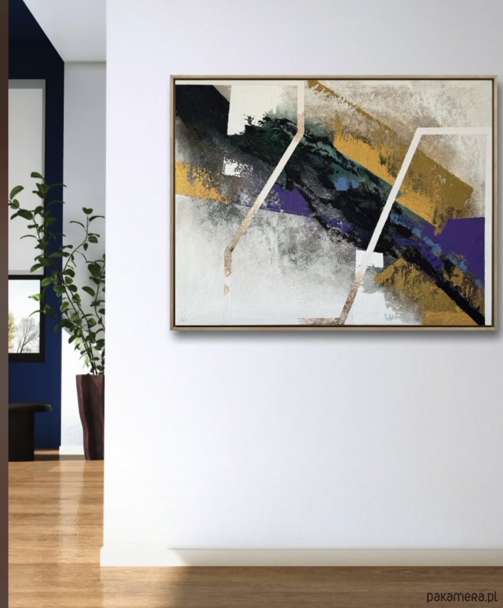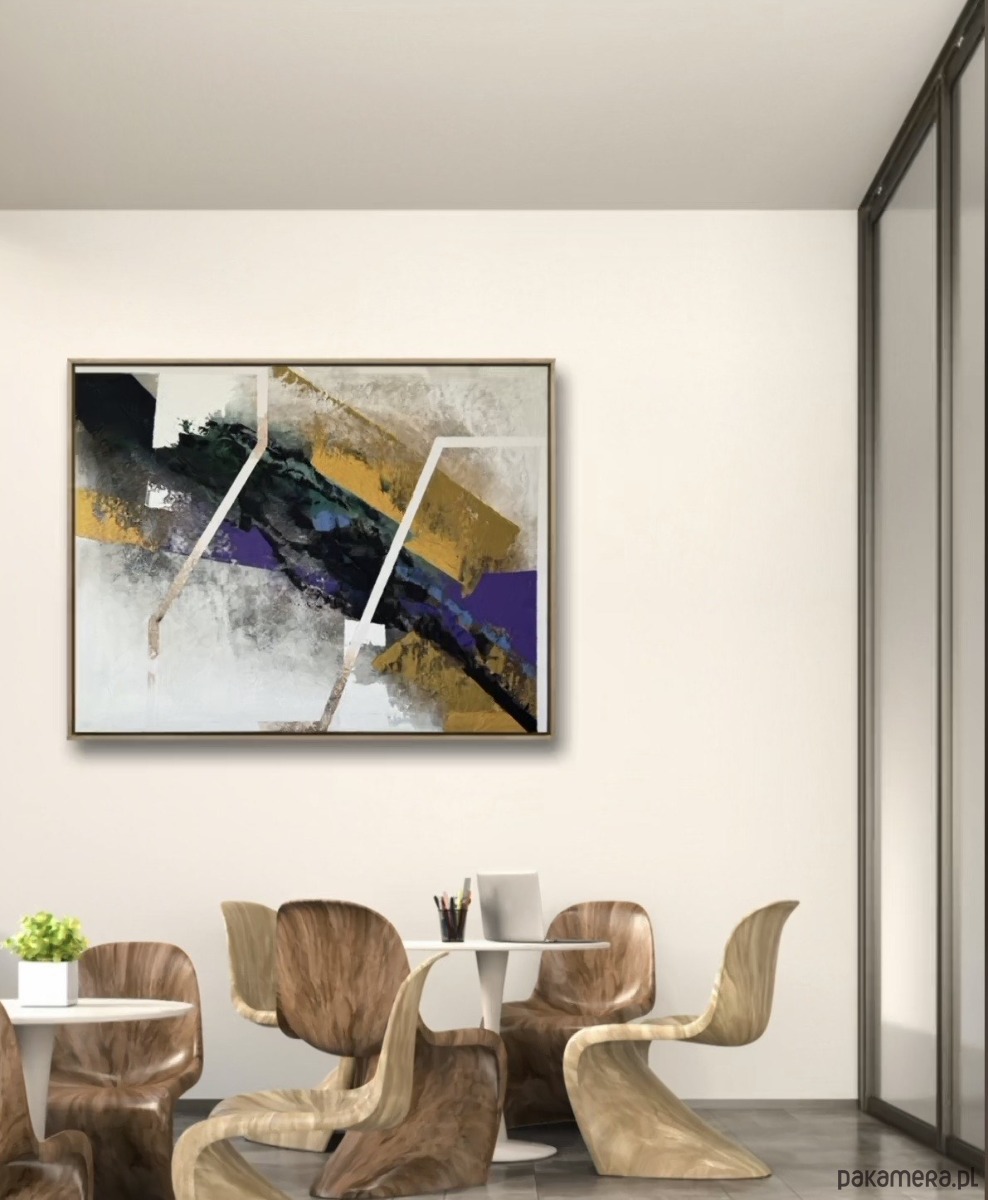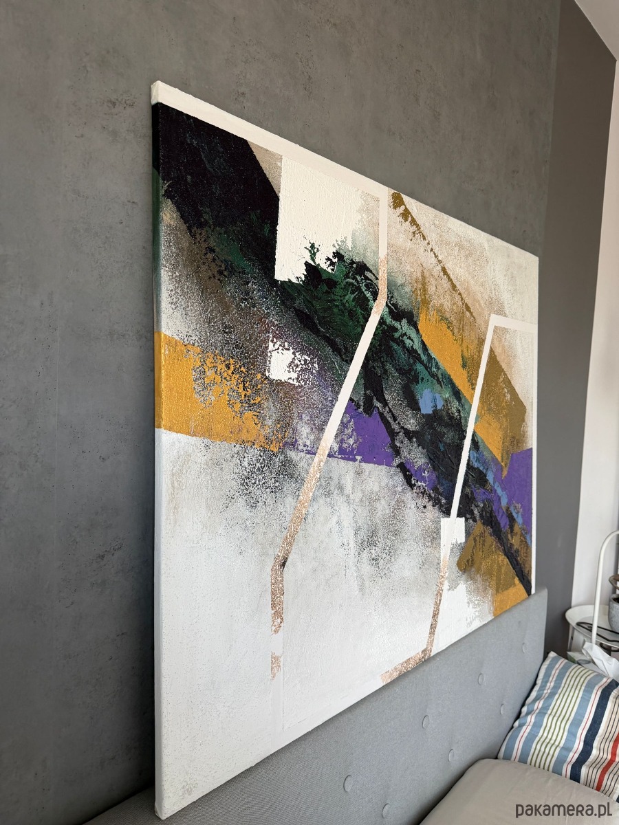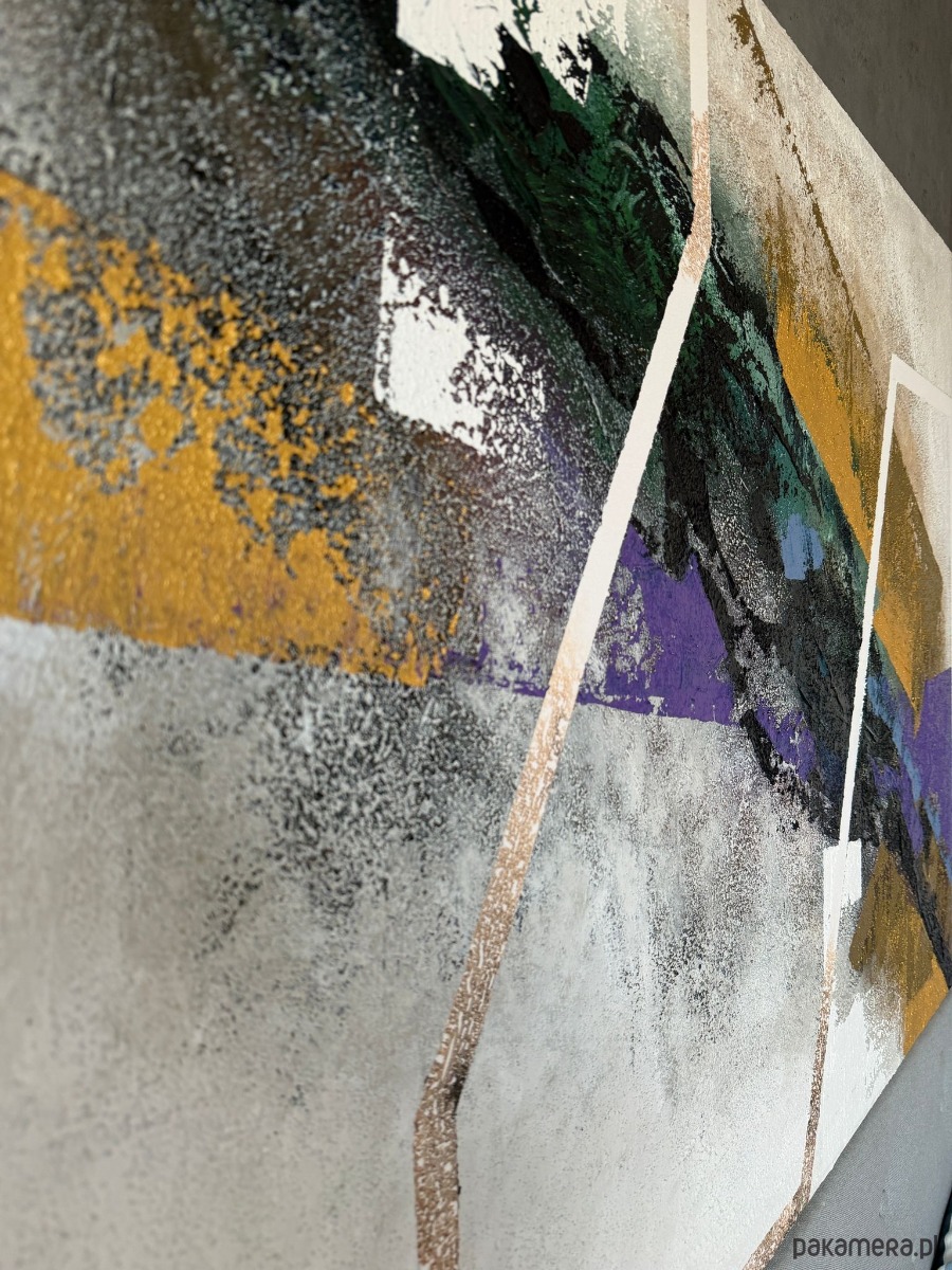 Złote, fioletowe i zielone tony splatają się z siłą i ruchem, budując kontrasty balansujące pomiędzy strukturą a intuicją. To praca, która przywołuje to, co wydaje się oczywiste, lecz nieustannie się zmienia, przesuwa i przeobraża — iluzja nabierająca kształtu na naszych oczach.