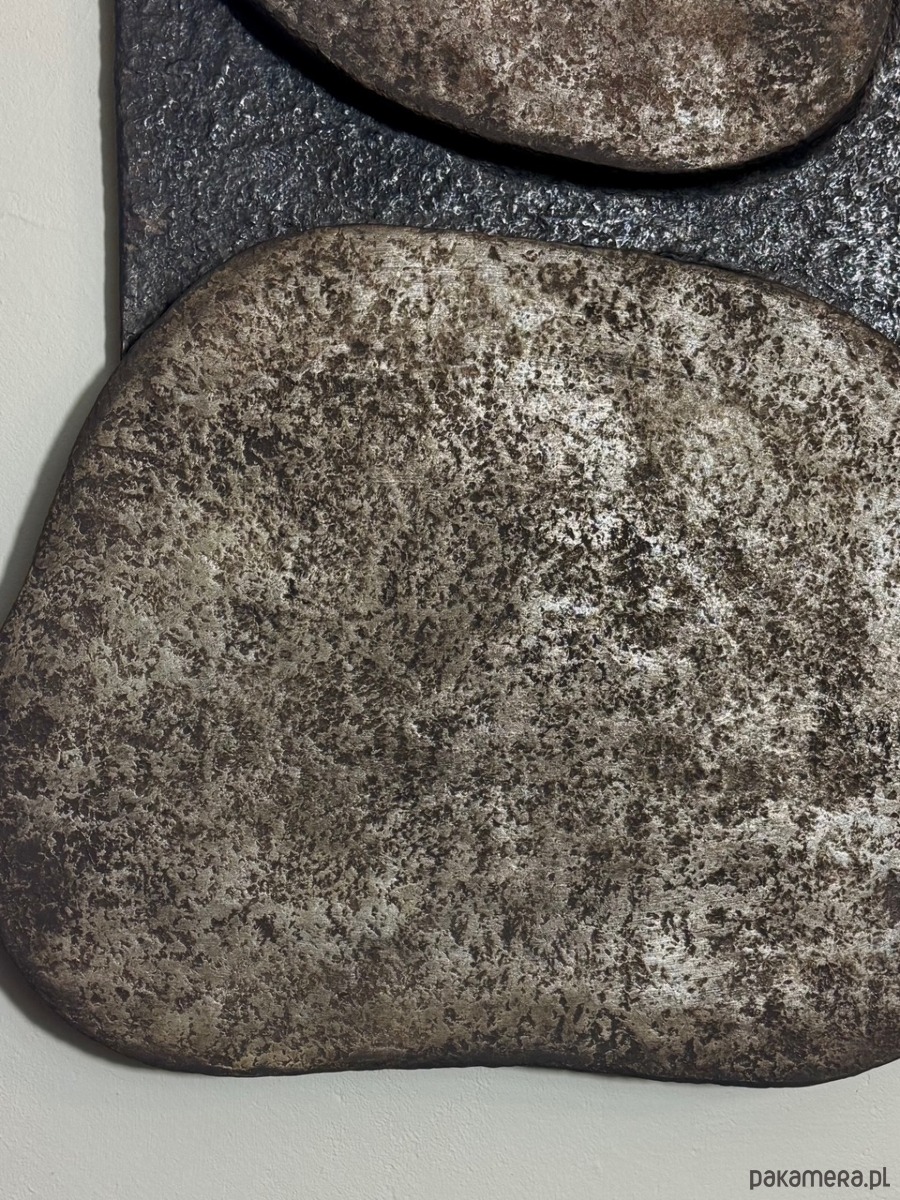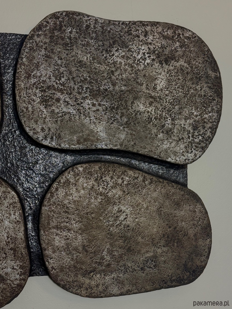 To praca na pograniczu obrazu i obiektu – malarska rzeźba ścienna.
