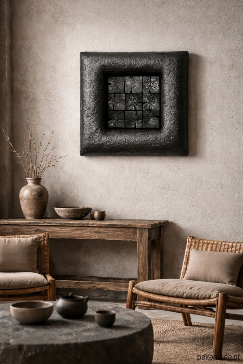 Obraz wpisuje się w estetykę organicznego minimalizmu i Wabi-Sabi, idealnie pasując do luksusowych i industrialnych wnętrz, stanowiąc ich architektoniczny punkt ciężkości.