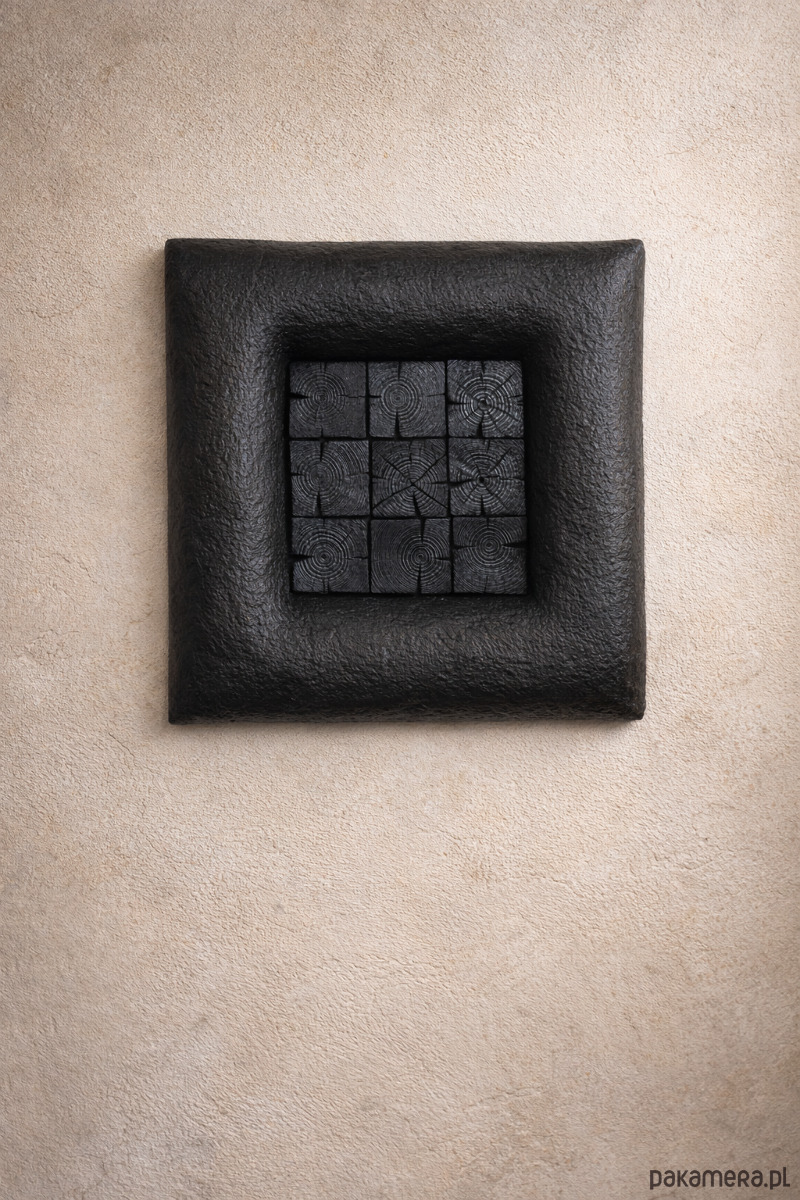 Wewnątrz kompozycji umieszczono drewniane płytki (10x10 cm), poddane obróbce ogniem japońską metodą Shou Sugi Ban. Zwęglona struktura drewna uwydatnia głębię czerni i symbolizuje transformację materii pod wpływem ognia jako siły natury.