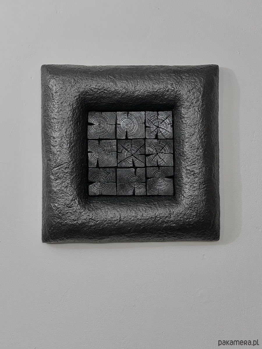 Dzieło jest studium monochromatycznej tekstury. Centralnym i najbardziej intrygującym elementem jest szeroka, wypukła rama (szerokość 15 cm). Jej nieregularna, organiczna powierzchnia, wymodelowana z gliny papierowej, została w całości pokryta intensywnym grafitem. To wykończenie nadaje ramie surowość i monumentalność.