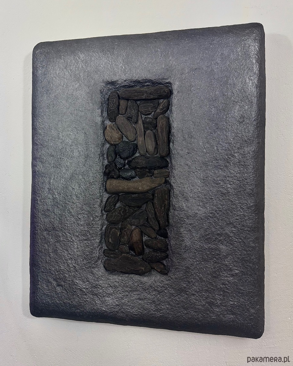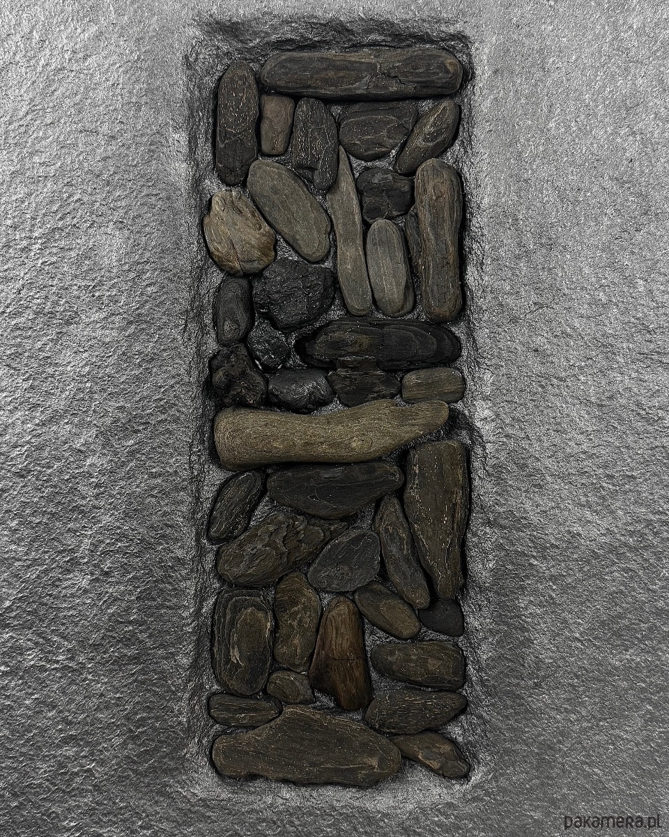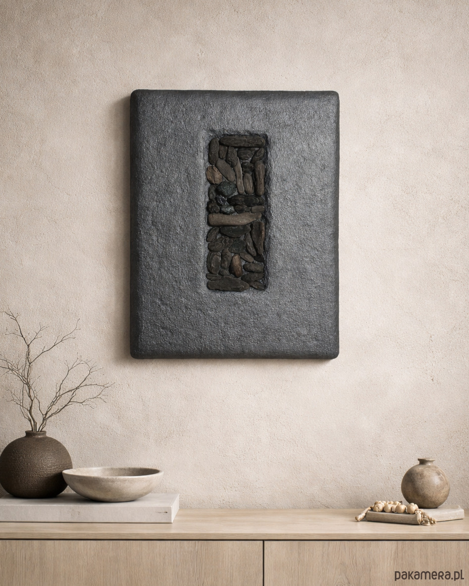 Kompozycja ma wyraźny, wertykalny układ zbudowany z naturalnych drewnianych patyków driftwood, osadzonych w grafitowej, fakturalnej powierzchni. Kontrast pomiędzy surowym tłem a organicznym drewnem porządkuje przestrzeń i nadaje pracy rytm.