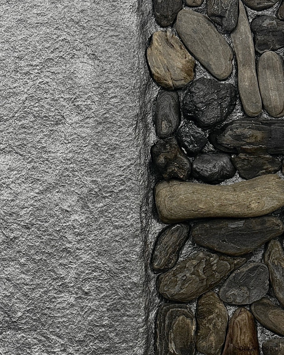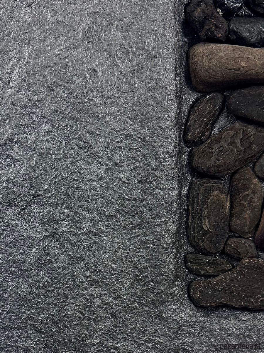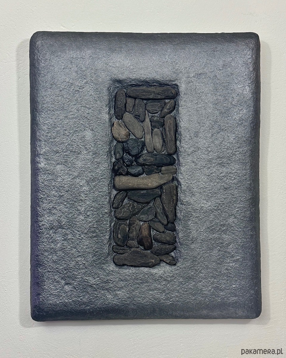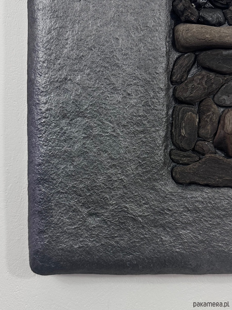Kompozycja ma wyraźny, wertykalny układ zbudowany z naturalnych drewnianych patyków driftwood, osadzonych w grafitowej, fakturalnej powierzchni. Kontrast pomiędzy surowym tłem a organicznym drewnem porządkuje przestrzeń i nadaje pracy rytm.
