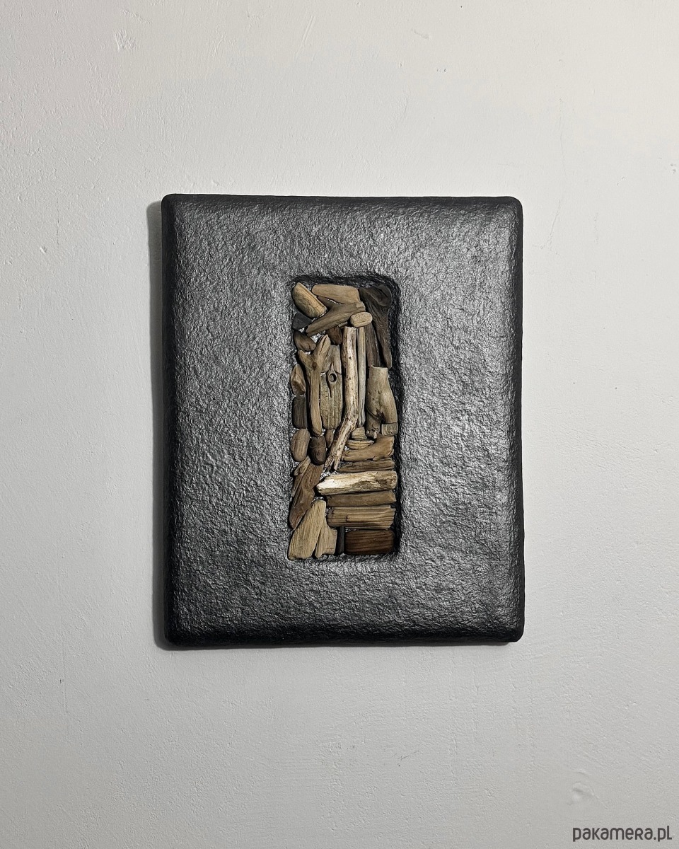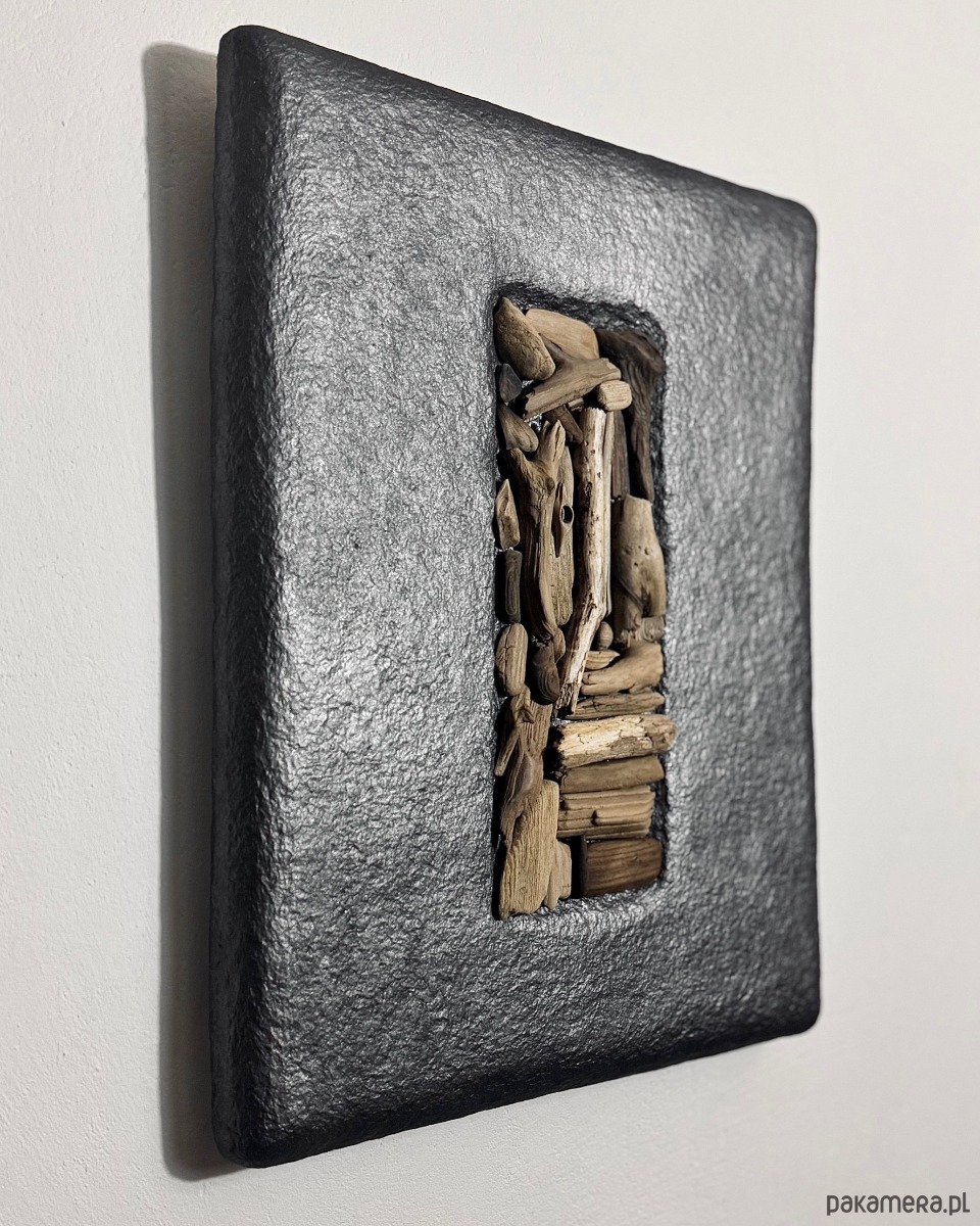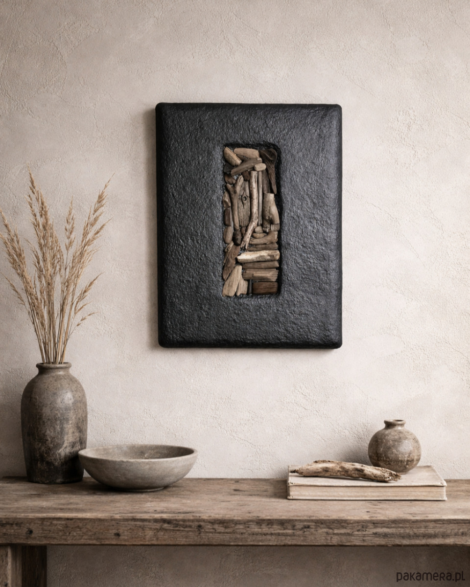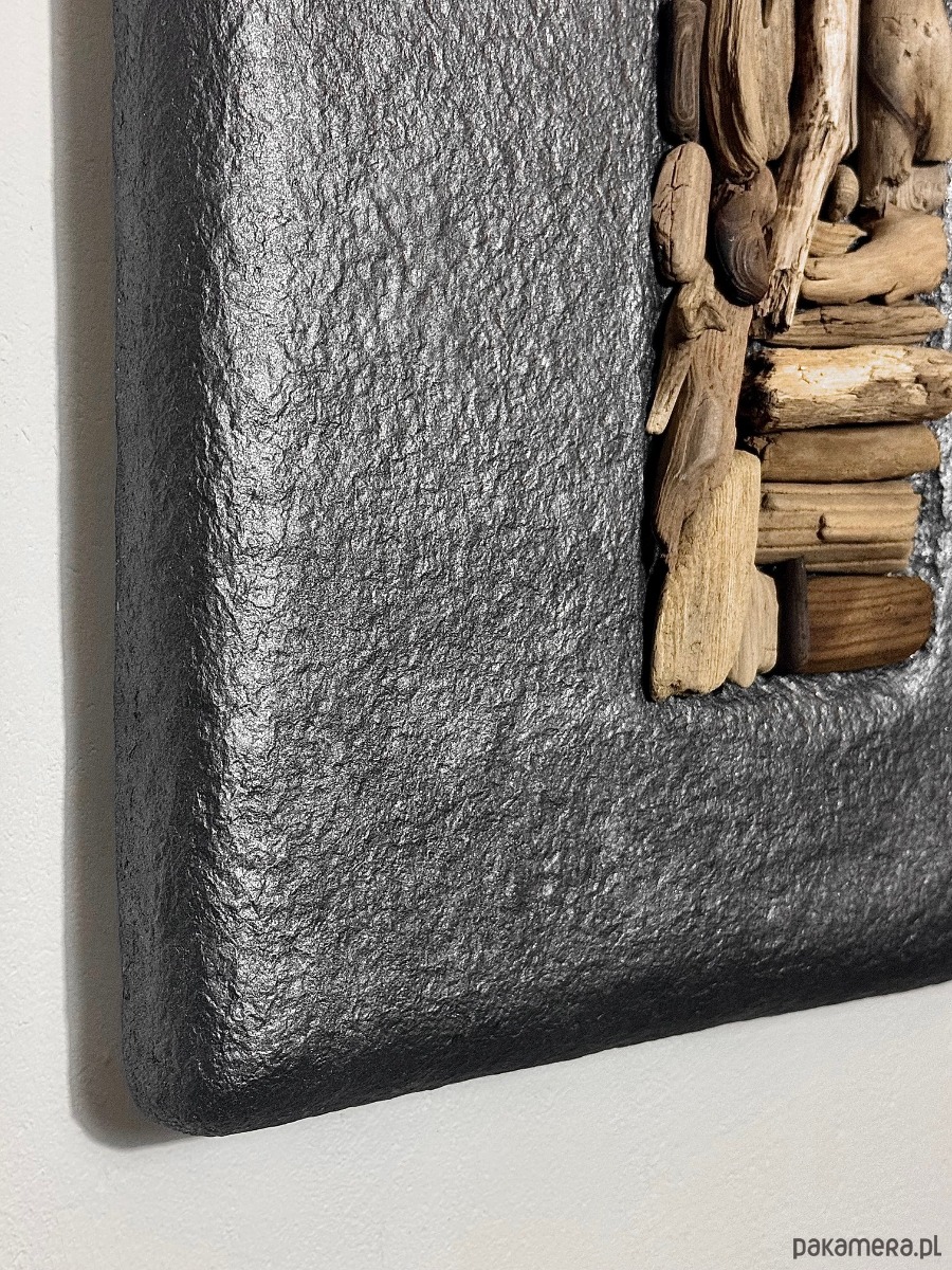 Kompozycja ma wyraźny, wertykalny układ zbudowany z naturalnych drewnianych patyków driftwood, osadzonych w grafitowej, fakturalnej powierzchni. Kontrast pomiędzy surowym tłem a organicznym drewnem porządkuje przestrzeń i nadaje pracy rytm.