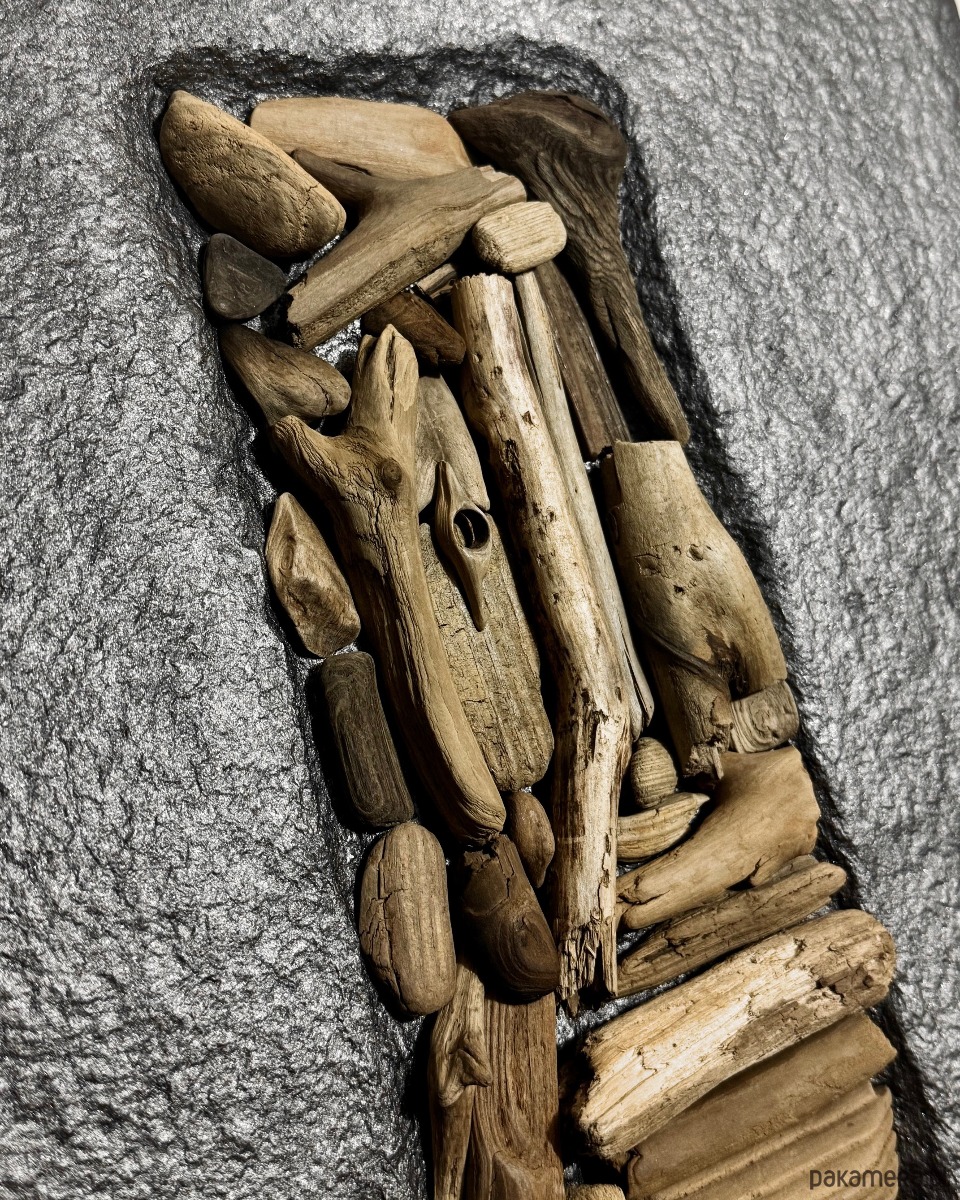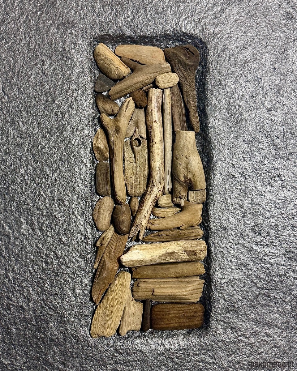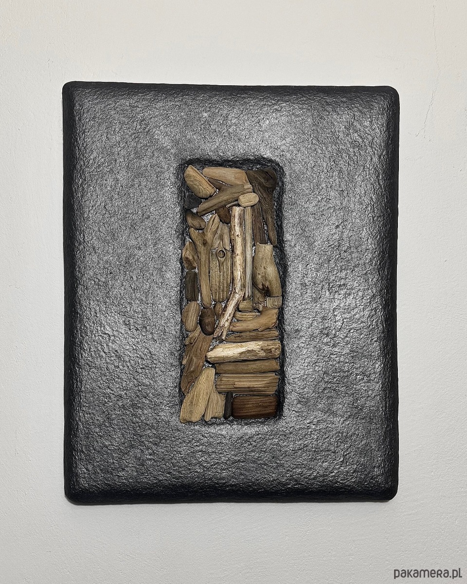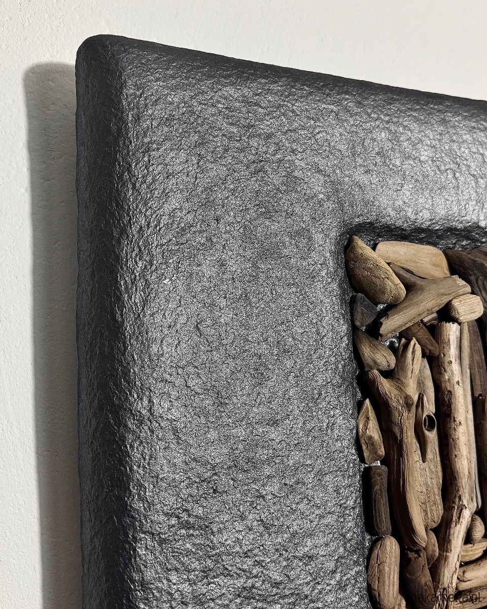 Kompozycja ma wyraźny, wertykalny układ zbudowany z naturalnych drewnianych patyków driftwood, osadzonych w grafitowej, fakturalnej powierzchni. Kontrast pomiędzy surowym tłem a organicznym drewnem porządkuje przestrzeń i nadaje pracy rytm.