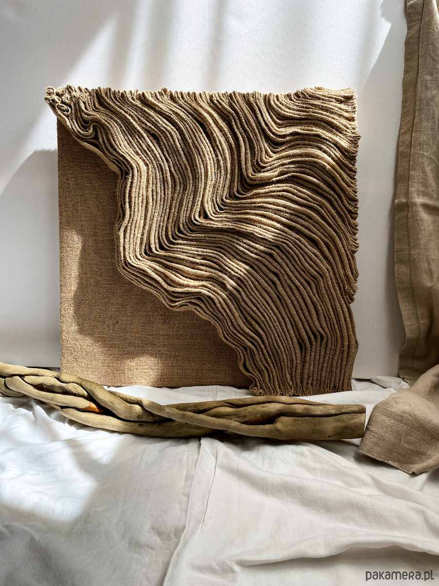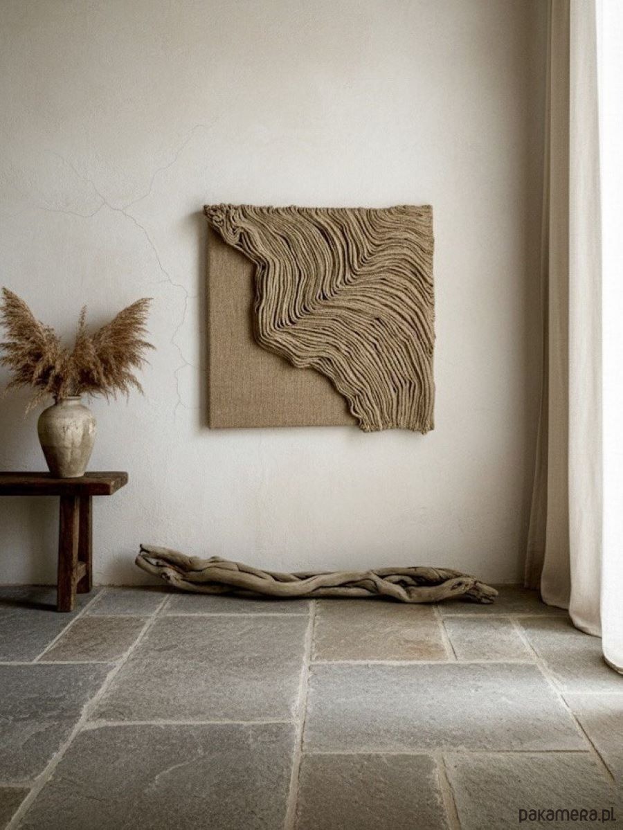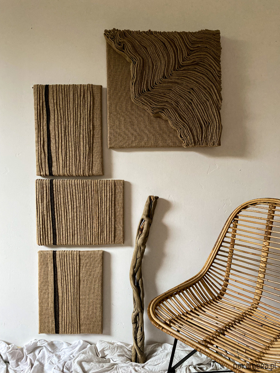 Minimalistyczny obraz strukturalny z tkaniny jutowej JUTE FLOW- doskonały dodatek do nowoczesnych aranżacji.