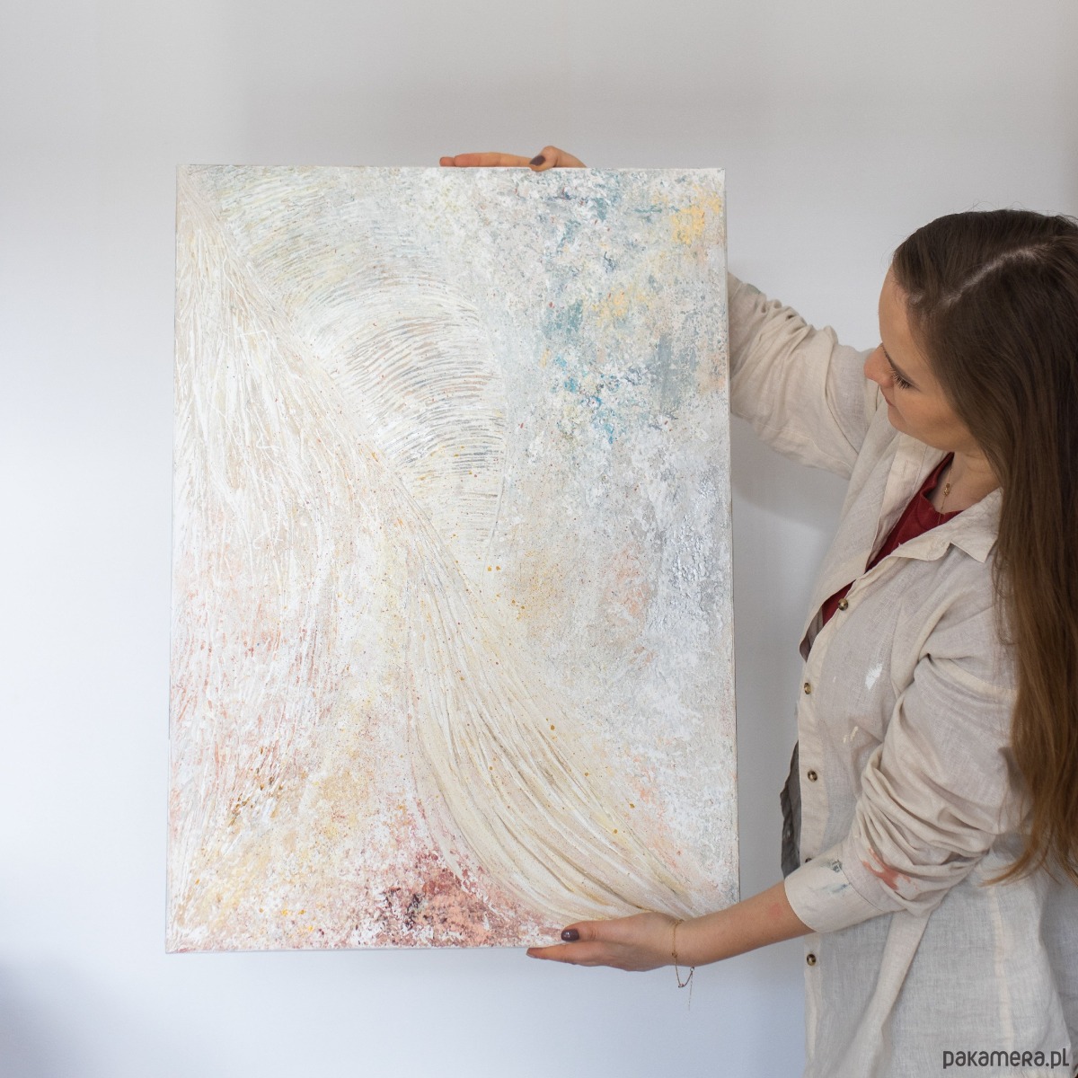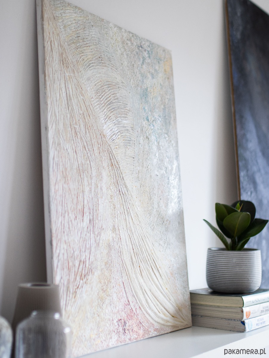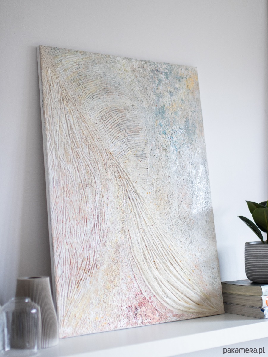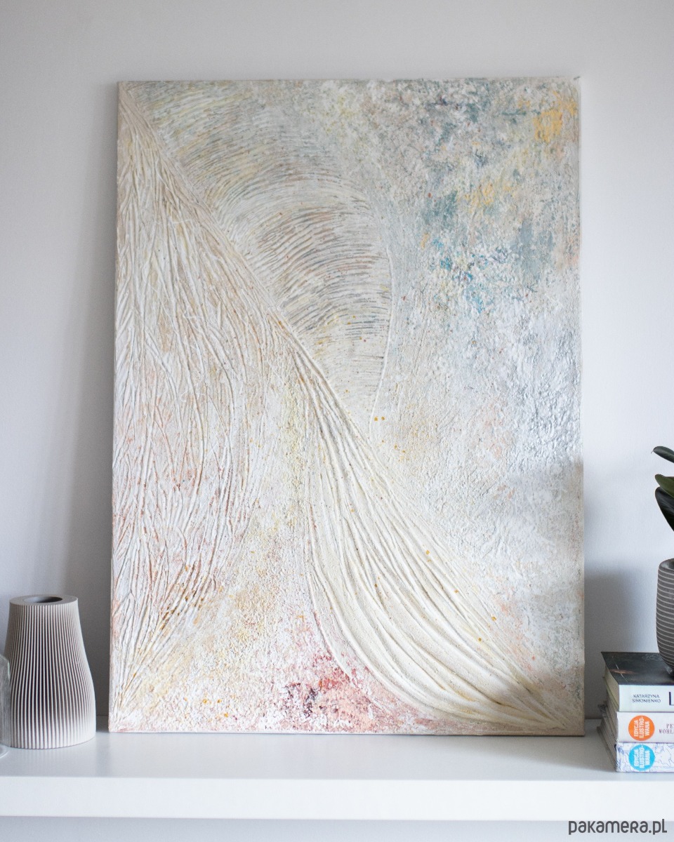 Obraz ,,NEUVO''- obraz strukturalny wykonany ręcznie na płótnie, w jasnych, neutralnych barwach, o rozmiarach 50 cm x 70 cm. To wyjątkowa i oryginalna dekoracja, która doda świeżości i charakteru do każdego pomieszczenia. Wykonanie za pomocą szpachelki malarskiej nadaje mu unikatowego wyglądu i struktury. Dzięki wysokiej jakości materiałom obraz prezentuje się solidnie i trwale. Jego uniwersalny design sprawia, że doskonale komponuje się zarówno z nowoczesnymi, jak i klasycznymi aranżacjami wnętrz. Idealnie będzie się prezentował w pomieszczeniach w stylu Japandi, Wabi Sabi, Scandi czy Boho.
