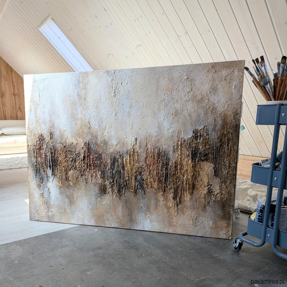 Obraz strukturalny wykonany ręcznie, z wyraźną, trójwymiarową fakturą budowaną warstwowo. Każdy element został stworzony autorską techniką, dzięki czemu obraz ma niepowtarzalną strukturę i charakter.
